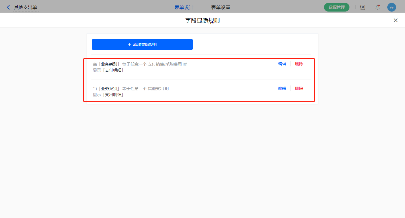 8)设置两条显隐规则,当【业务类别】字段等于支付销售/采购费用显示【支付明细】字段,当【业务类别】字段等于其他支出显示【支出明细】字段;