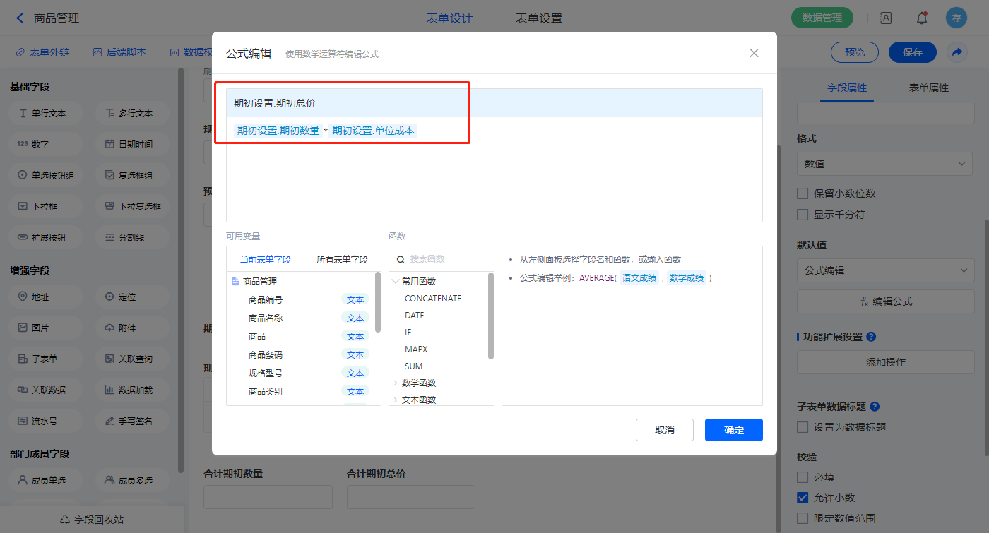【期初设置.期初总价】字段设置默认值为公式编辑,如图设置公式;