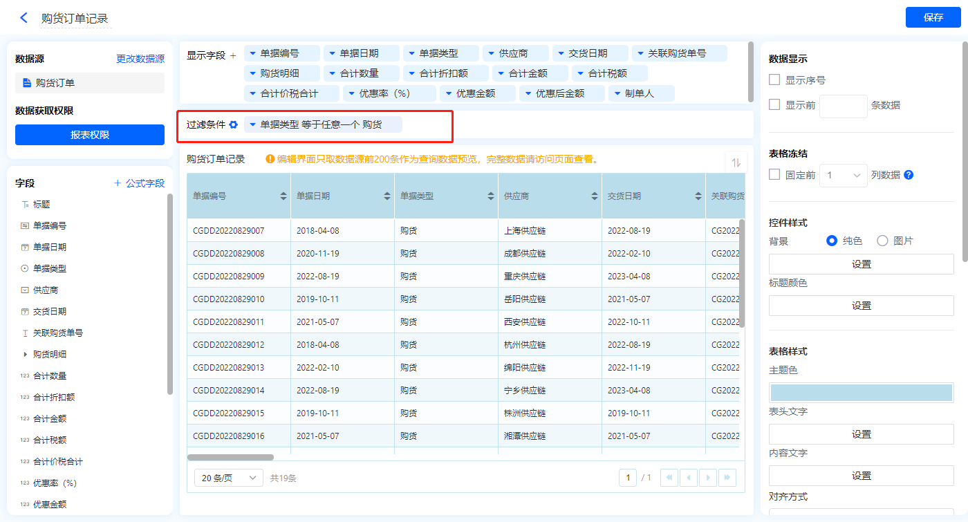 1)新增【历史购货单】报表,用基础报表【数据表】展示数据源为表单【购货单】的数据;