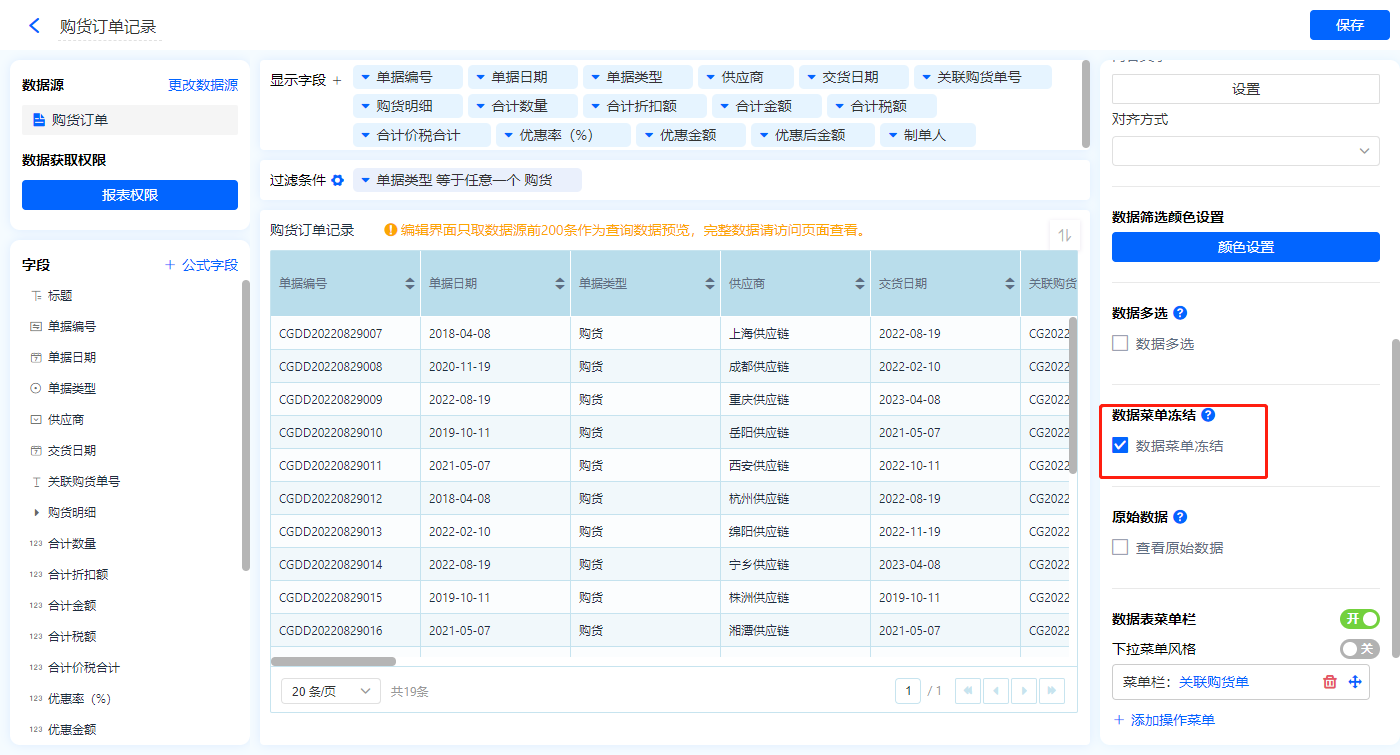 4)数据菜单冻结属性打钩,固定数据表菜单栏位置;