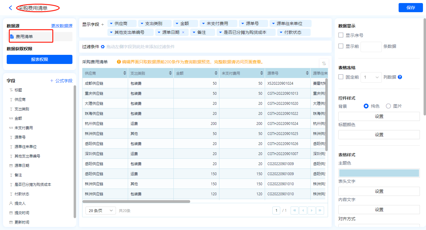 1)新增【费用清单】报表,用基础报表【数据表】展示数据源为表单【费用清单】的数据;