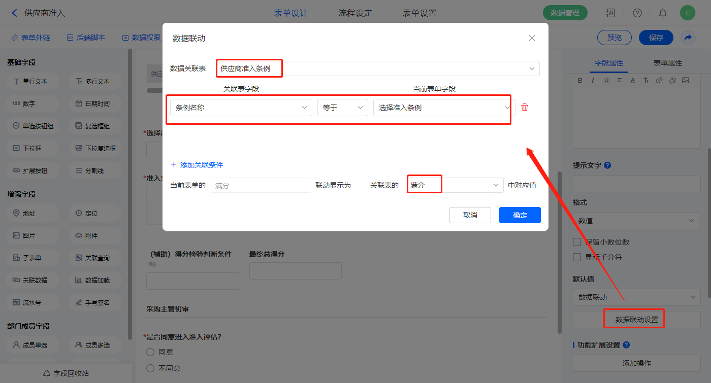 4)【满分】字段,设置默认值为数据联动,设置联动条件及联动字段;