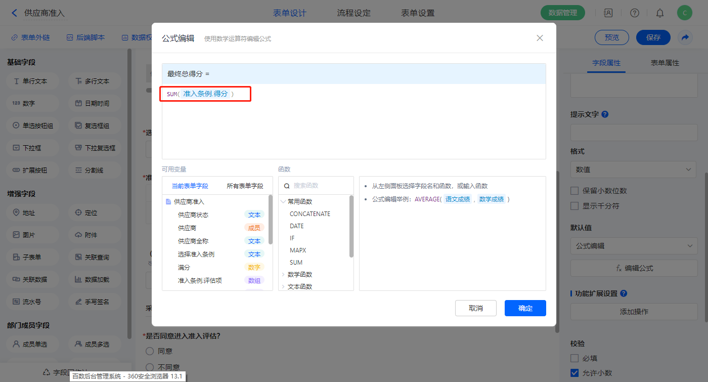 【(辅助)得分检验判断条件】字段,设置默认值为公式编辑,如图设置公式;