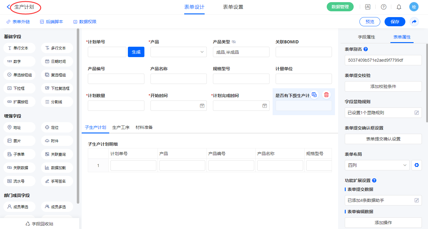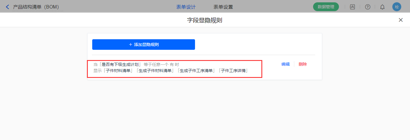 7)表单属性设置显隐规则,当【是否有下级生产计划】字段等于有,显示【标签页.子生产计划】字段;