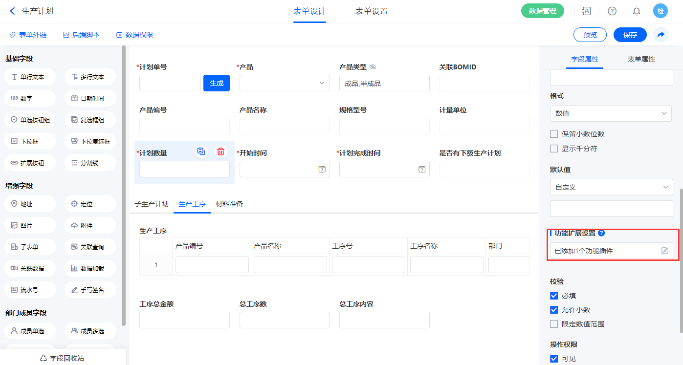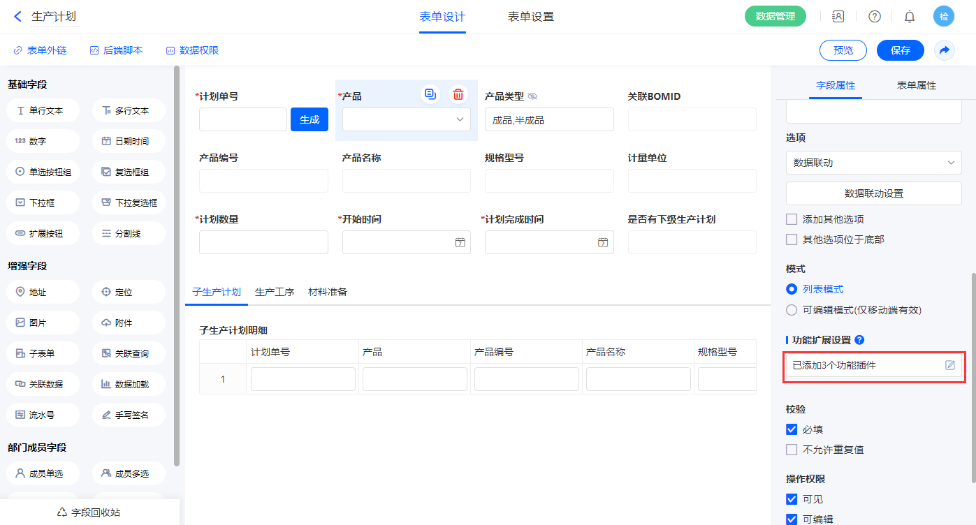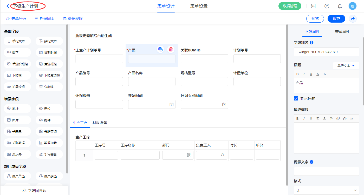 2.4、表单【产品结构清单(BOM)】字段及表单属性设置
