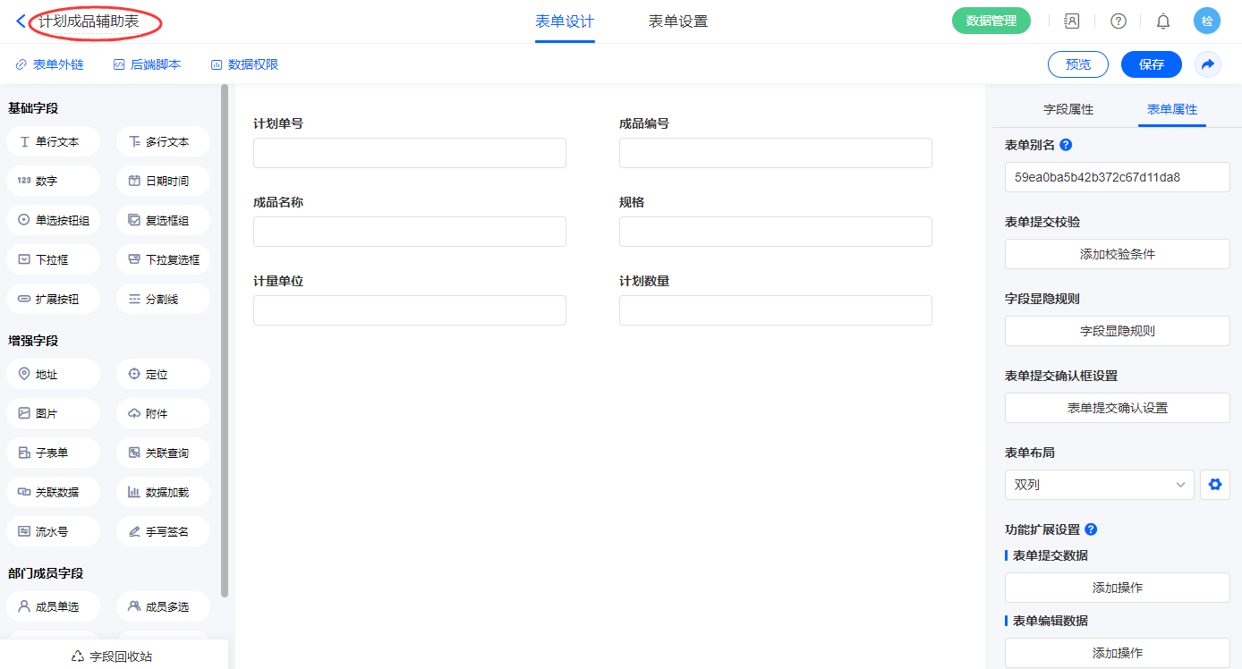 10)新增表单【计划成品辅助表】,字段设置如下;