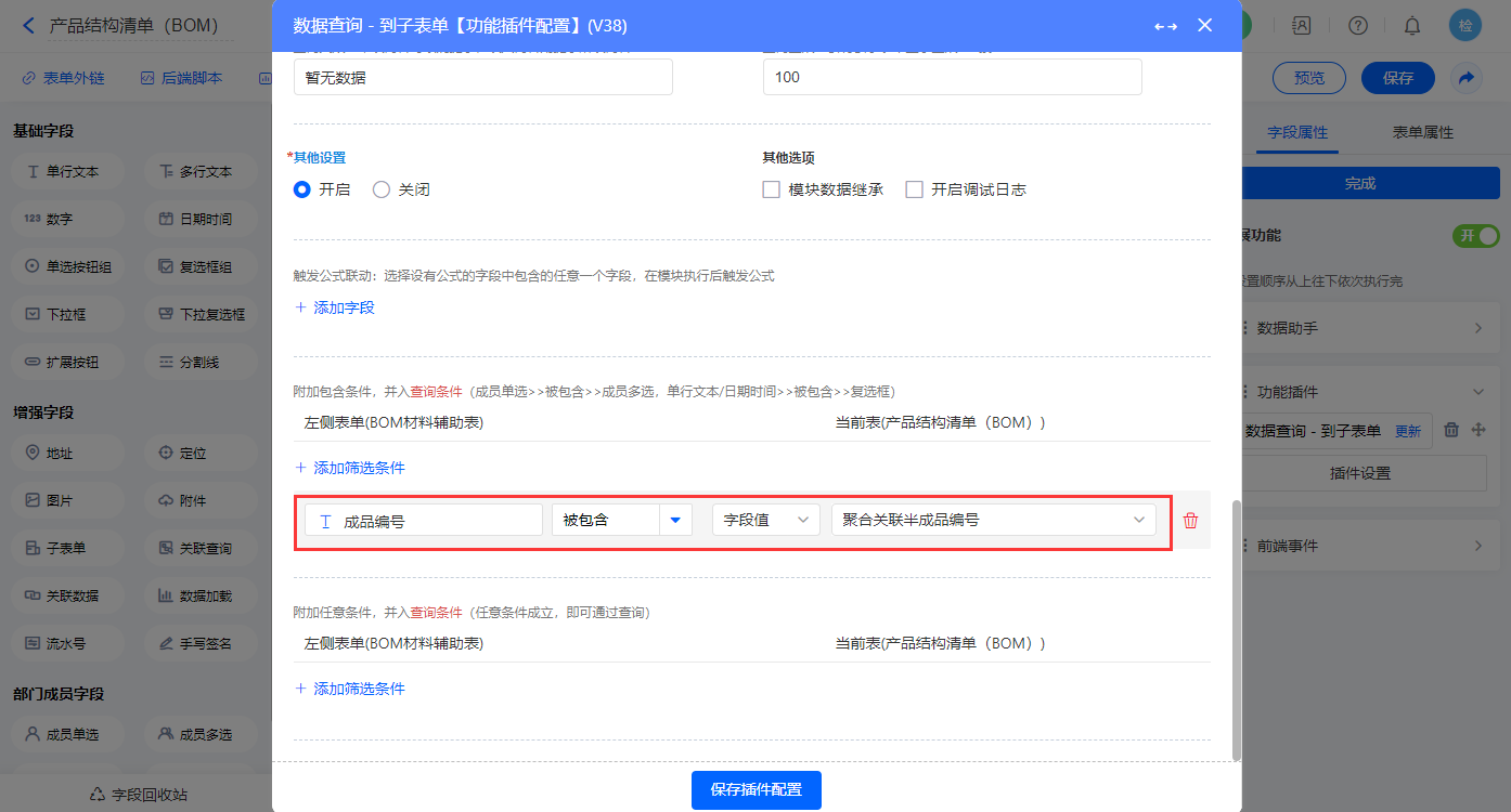 其他设置触发条件为【BOM类型】字段等于成品,设置好点击【完成】并保存该数据助手;