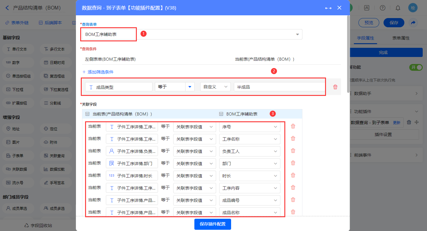 【生成子件工序清单】按钮如图配置功能模块【数据查询 - 到子表单】;