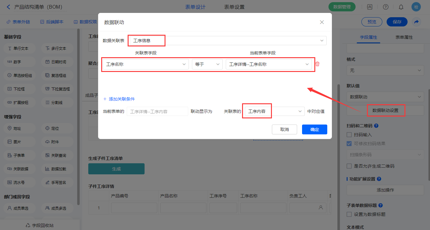 【关联BOMID】、【是否有下级生产计划】字段设置默认值为数据联动,关联表及关联条件相同,设置对应的联动字段即可;