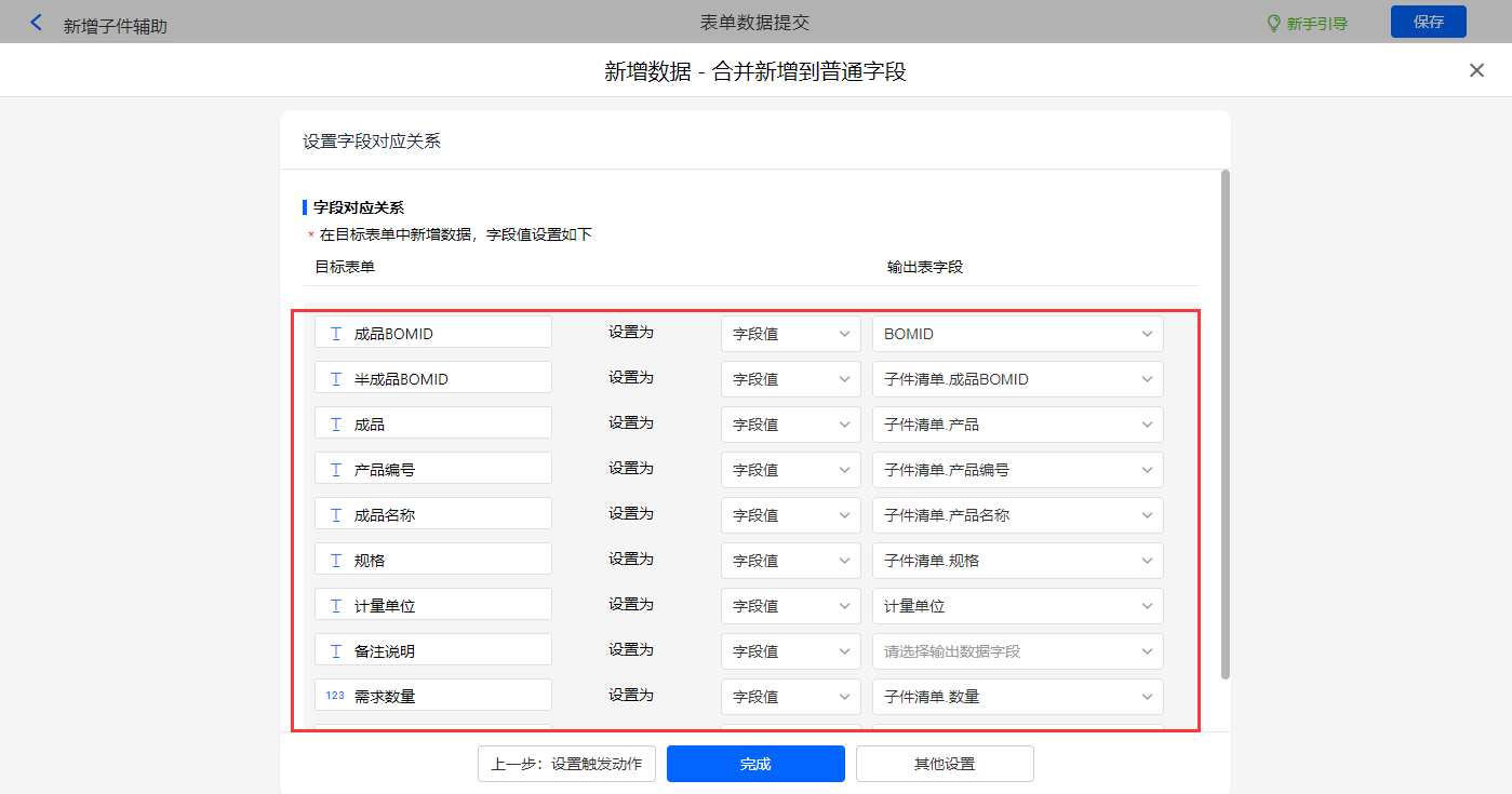 选择目标表单【计划成品辅助表】,设置对应赋值字段,设置好点击【完成】并保存该数据助手;