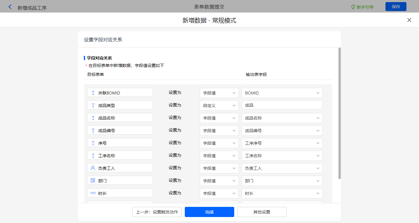 名称为生成下级生产计划工序的数据助手,新增新增数据执行动作,选择目标表单【生成下级生产计划工序】,设置对应赋值字段,设置好点击【完成】并保存该数据助手;