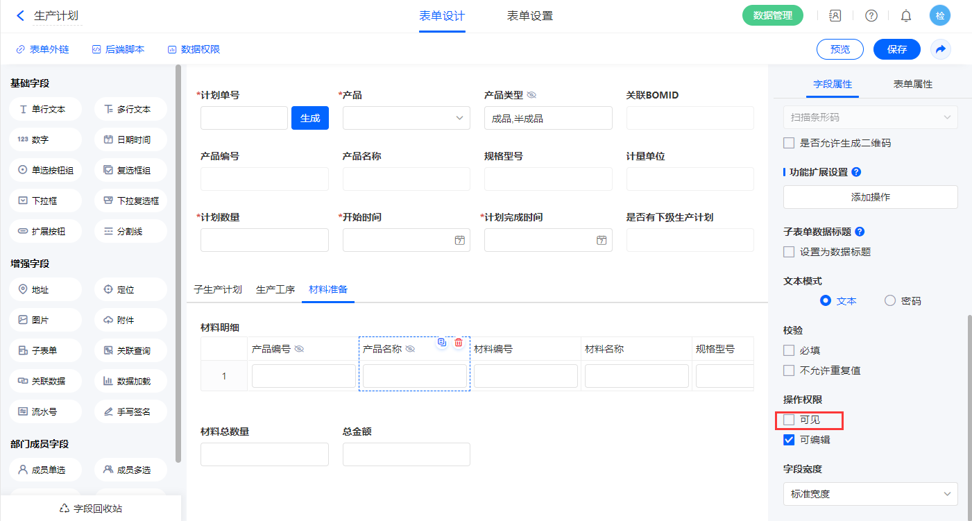 5)【产品类型】、【材料明细.产品编号】、【材料明细.产品名称】字段设置不可见;
