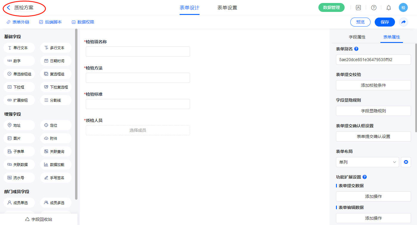 1)【过程检明细.质检项】字段,选择设置为关联其他表单数据,关联质检方案的【检验项名称】字段;