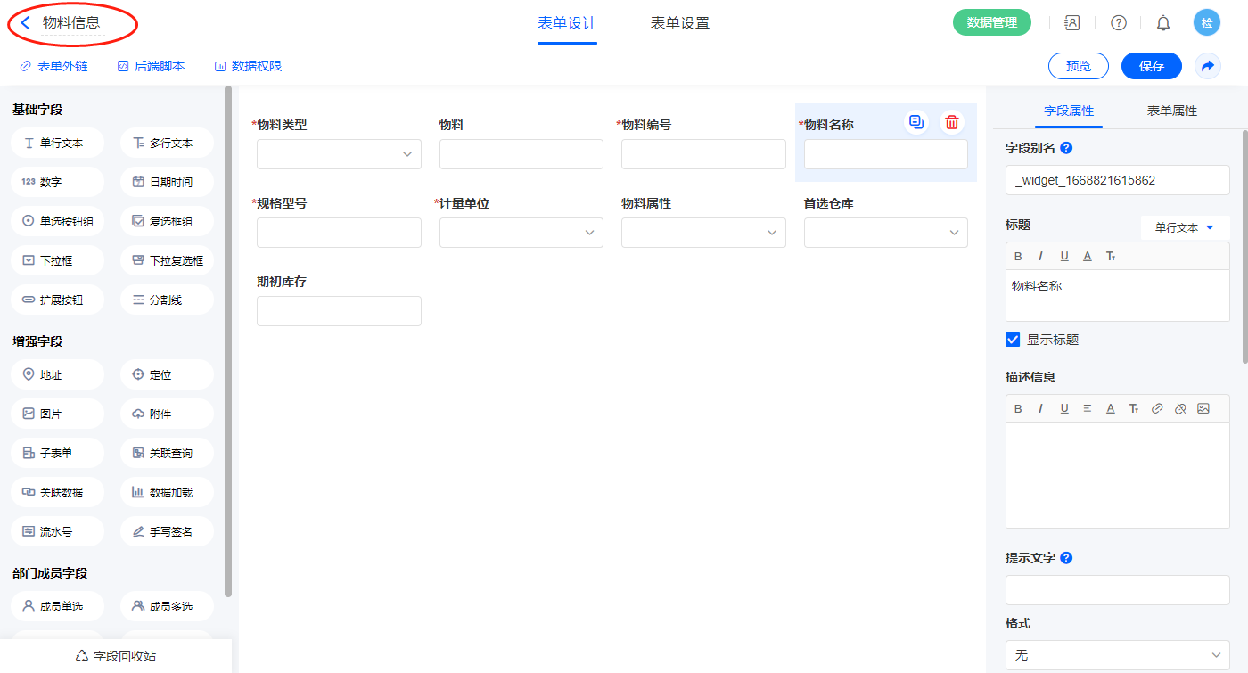 1)新增【物料信息表】报表,用基础报表【数据表】展示数据源为表单【物料信息】的数据;