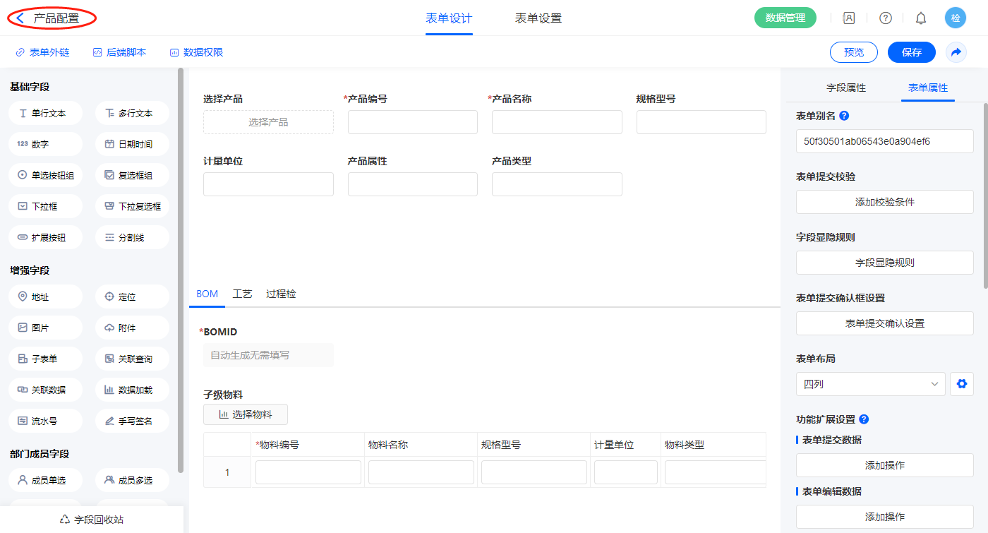 | 子级物料 | 子表单 | 工艺工序 | 子表单 |