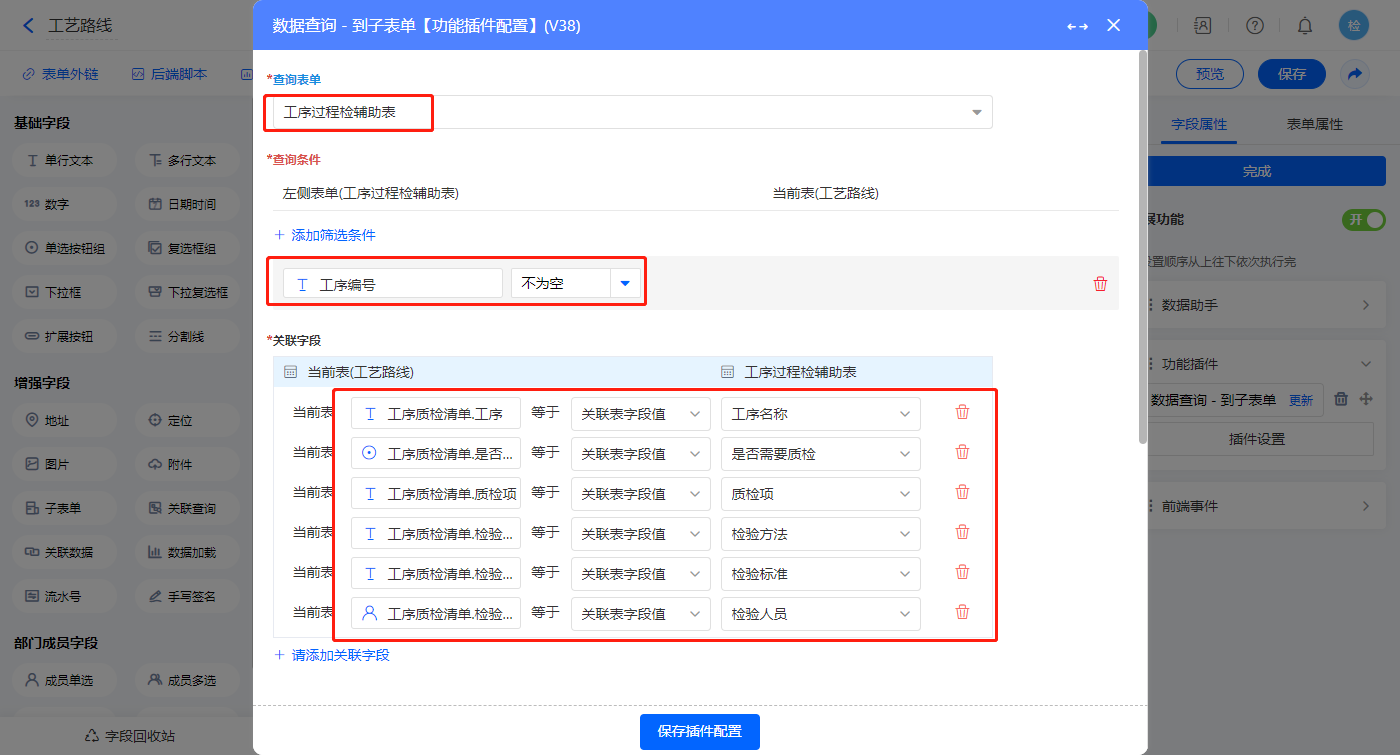 2)【工艺工序.名称】字段,选择设置为关联其他表单数据,关联工序的【工序名称】字段;