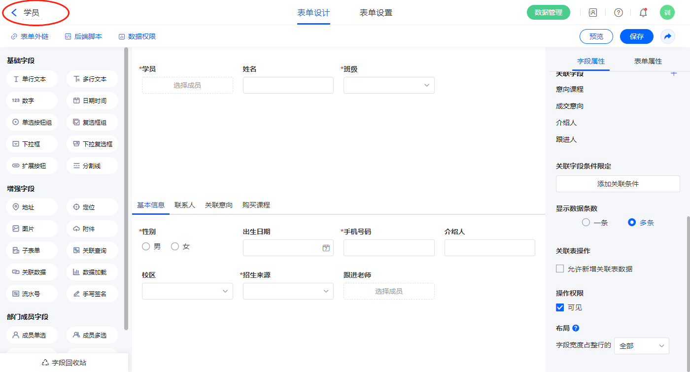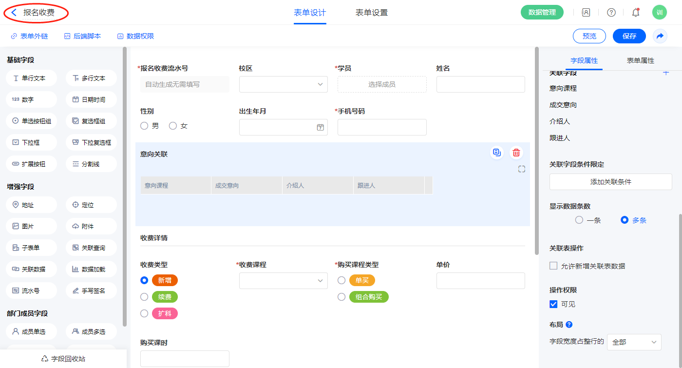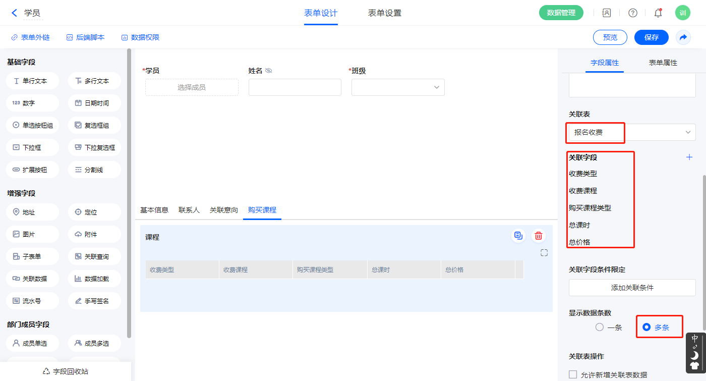 【课程】字段,设置关联表为【报名收费】并如图选择关联字段,设置显示数据条数为多条;