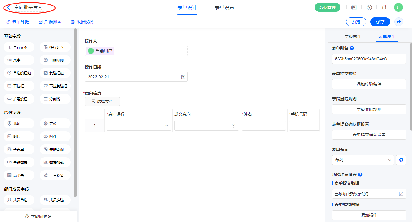 【批量导入】的报表菜单,操作模式设置为弹出表单【意向批量导入】;