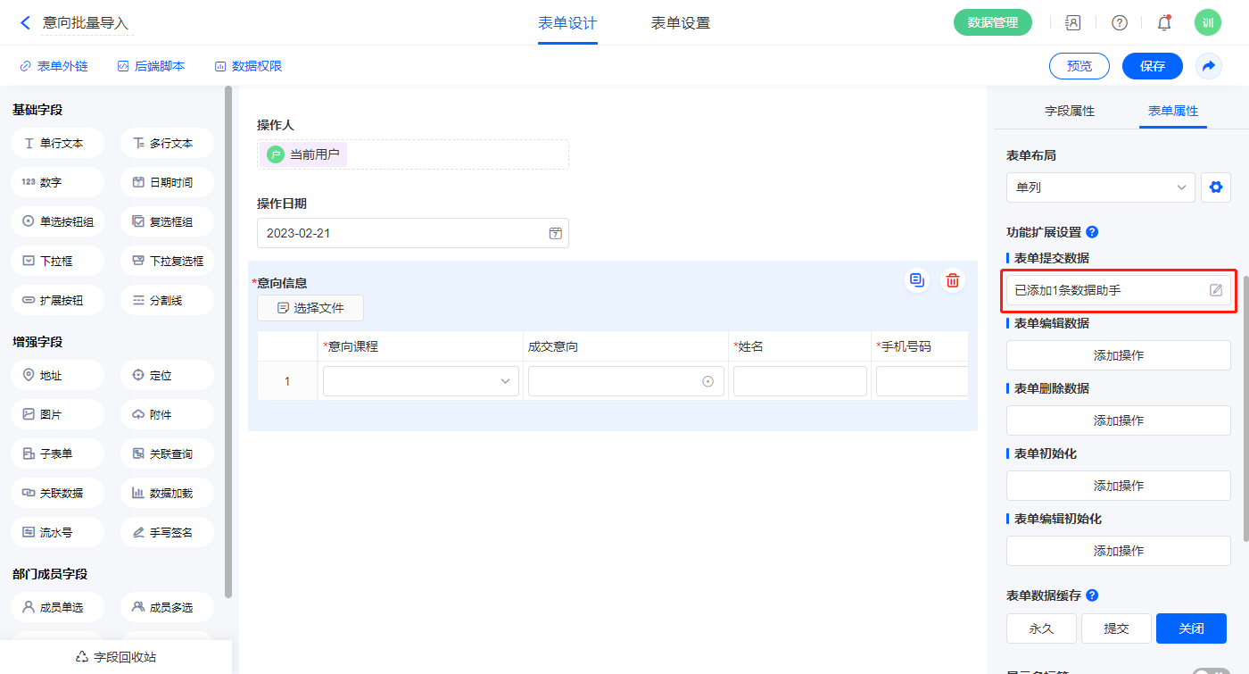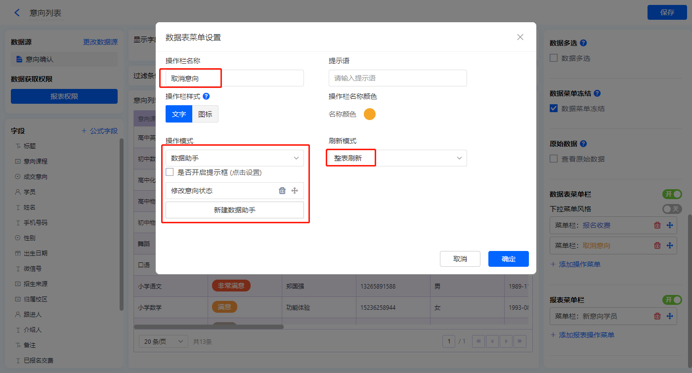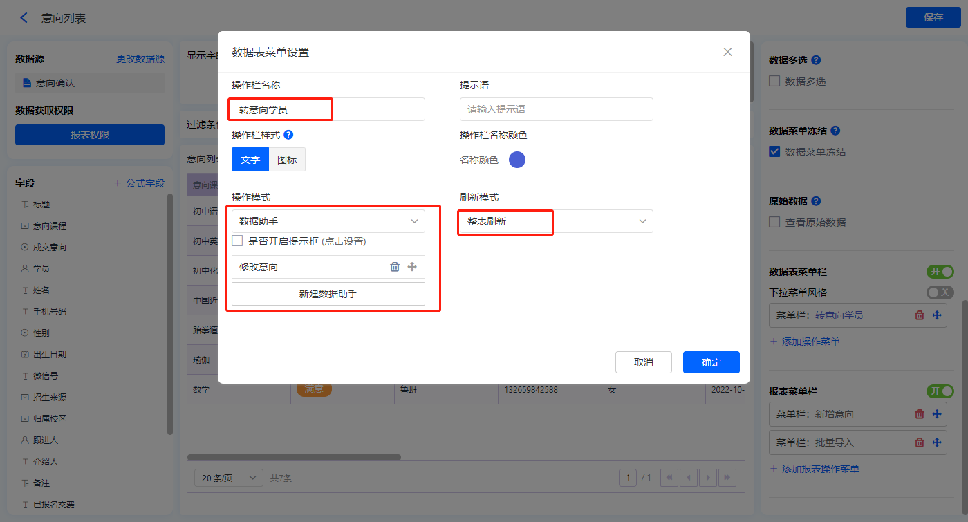 【转为意向学员】的菜单栏,操作模式设置为数据助手;