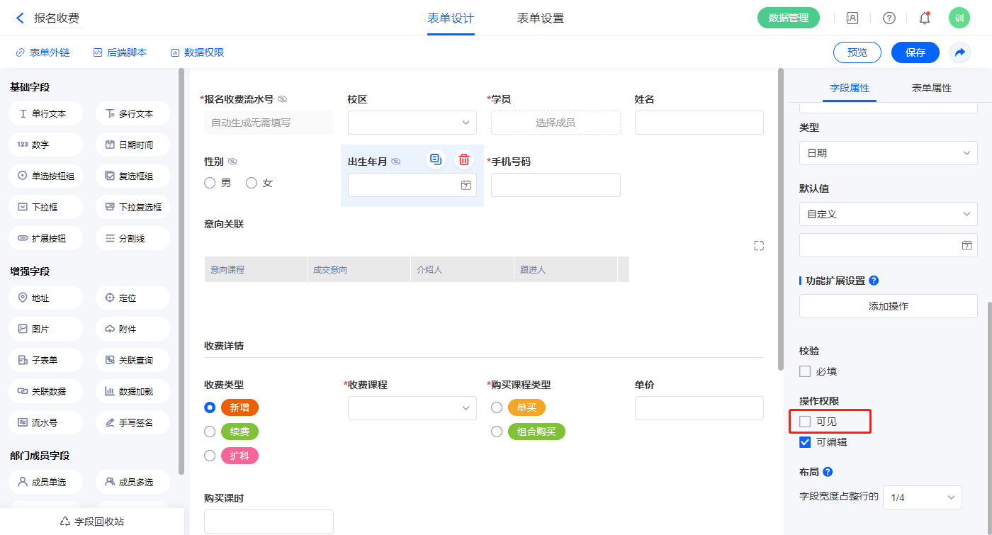 1)【报名收费流水号】、【出生年月】、【性别】、【购买总课时】、【关联收款单号】字段,设置操作权限为不可见;