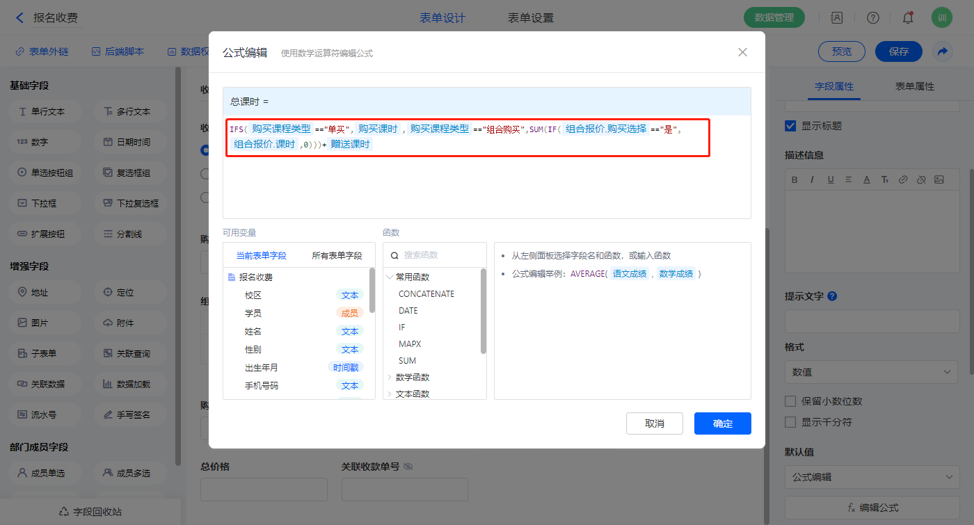 3)【购买总课时】字段,默认值选择公式编辑,如图设置公式;