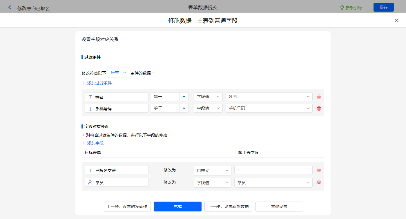 新增修改数据的执行动作,选择目标表单【意向确认】,添加过滤条件及对应修改字段,设置好点击【完成】并保存该数据助手;