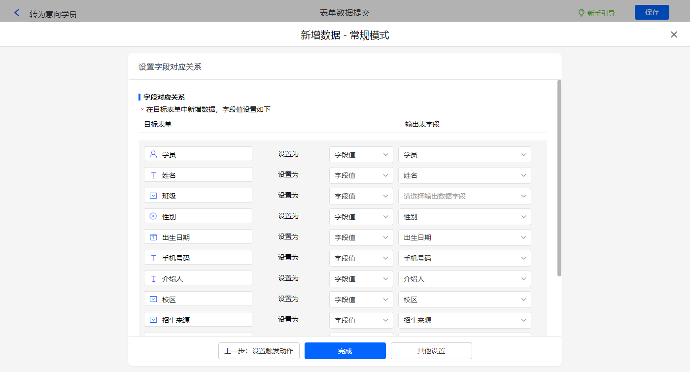 新增新增数据的执行动作,选择目标表单【意向确认】,选择对应赋值字段,置好点击【完成】并保存该数据助手;