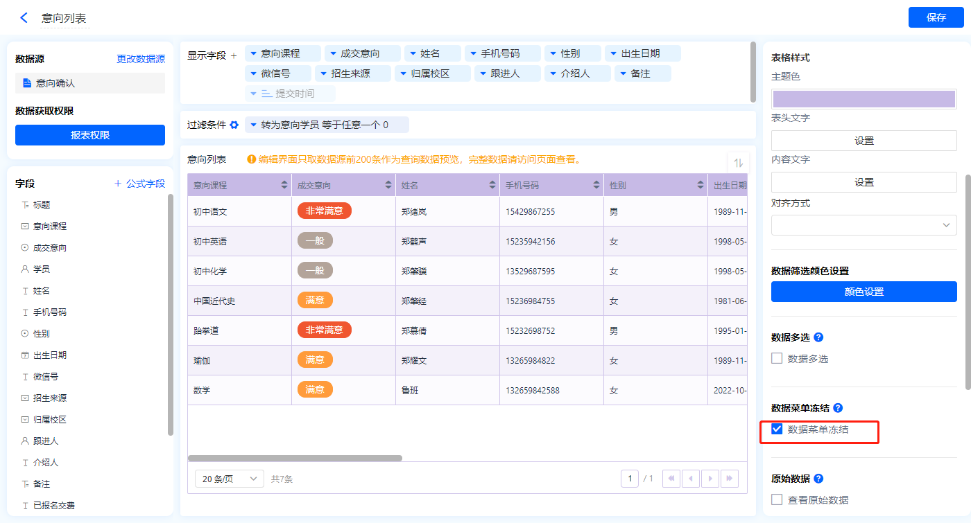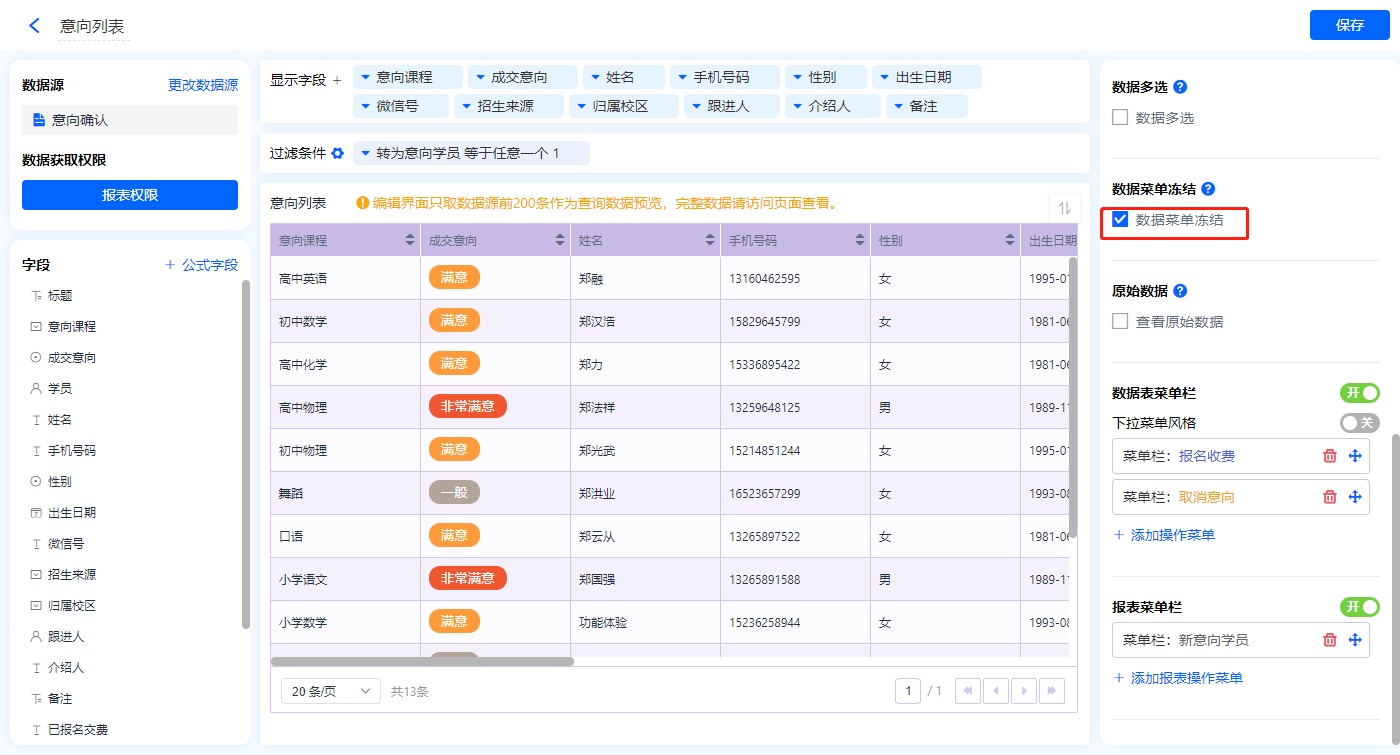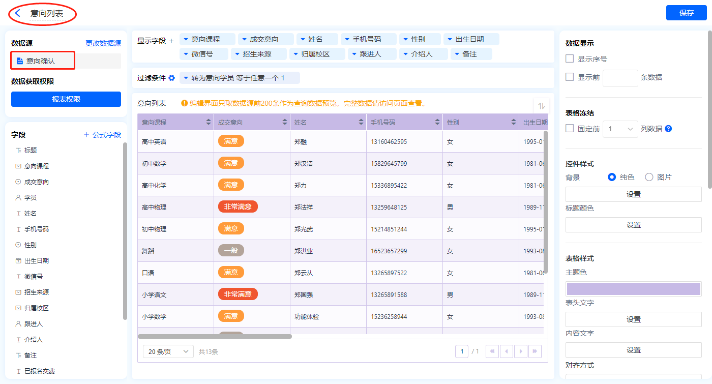 1)新增【意向学员】报表,用基础报表【数据表】展示数据源为表单【意向确认】的数据;