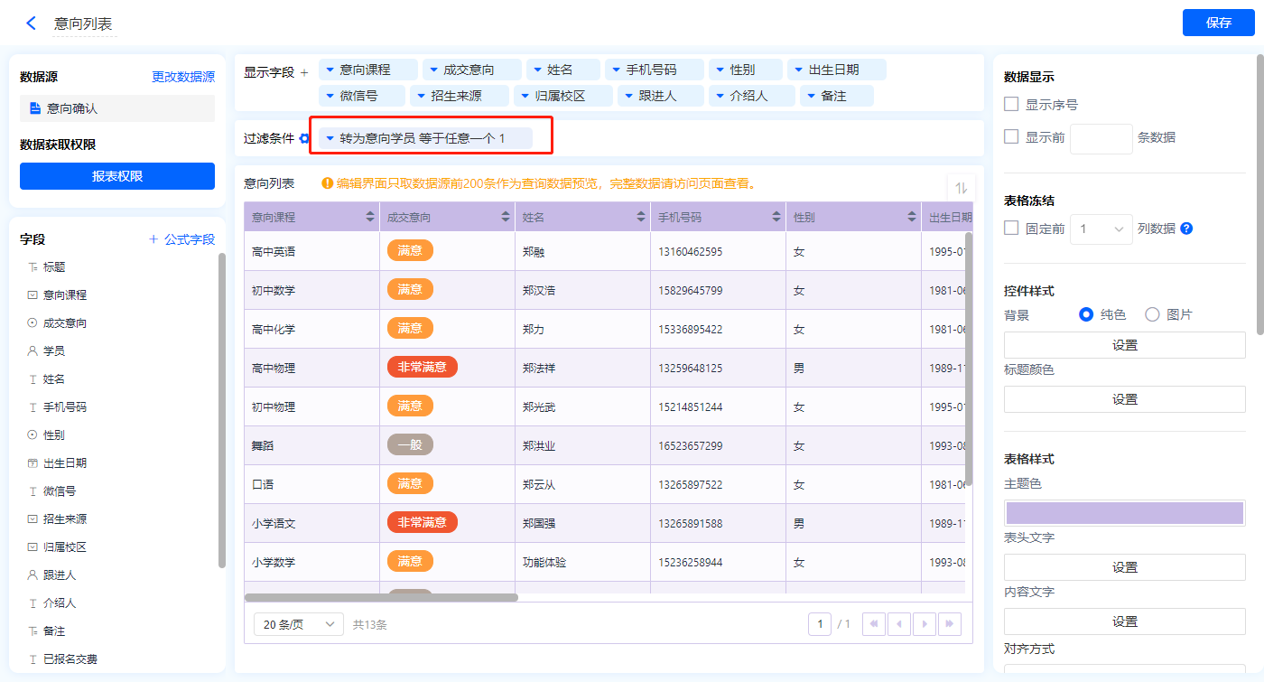 添加过滤条件,【转为意向学员】字段等于“1”;