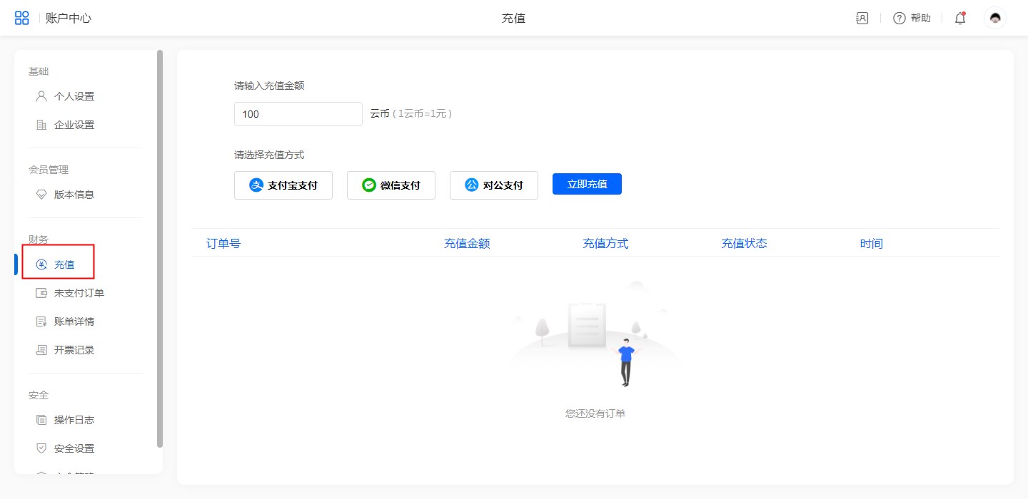 充值即进行账户余额充值,系统的消费均是云币,充值的方式支持支付宝、微信、对公支付这三种。