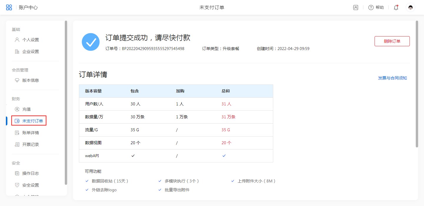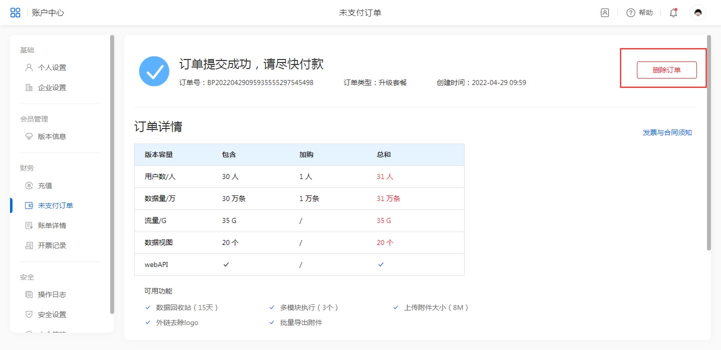 展示没有支付成功的订单,如果在购买套餐或升级套餐时因余额不足未支付的订单也会在此展示,可以充值后,再回到此页面支付即可。