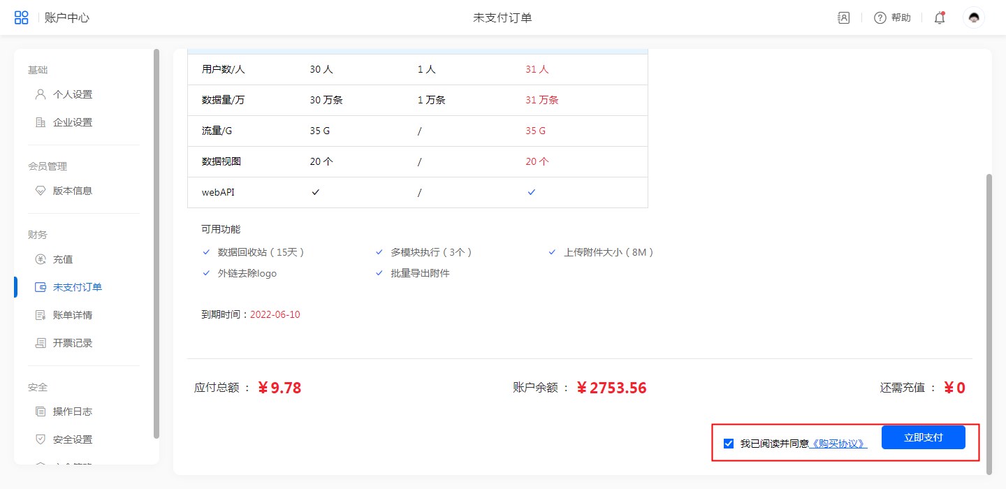如果账户余额充足时,显示立即支付按钮,点击立即支付进行支付,支付完成后账户购买或升级成功。