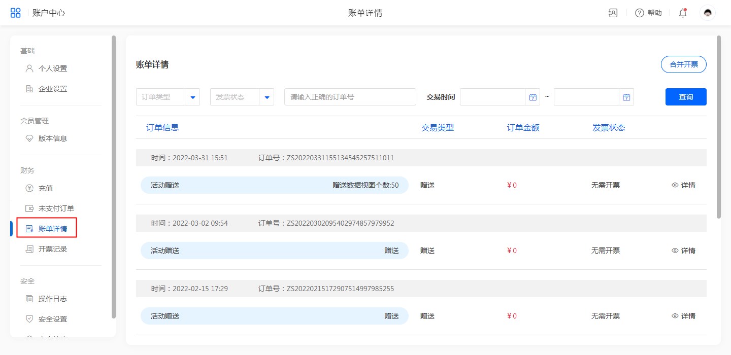 财务可以进行账户充值,还可查看消费的账单以及开发票。