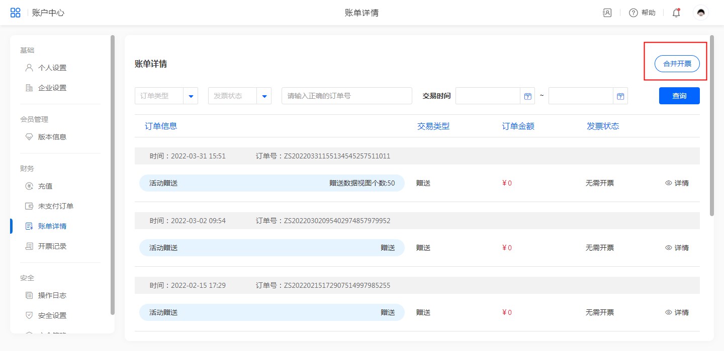 开票步骤:【合并开票】——【勾选需要开票的账单】——【确认开票】——【填写发票信息】——【确认】