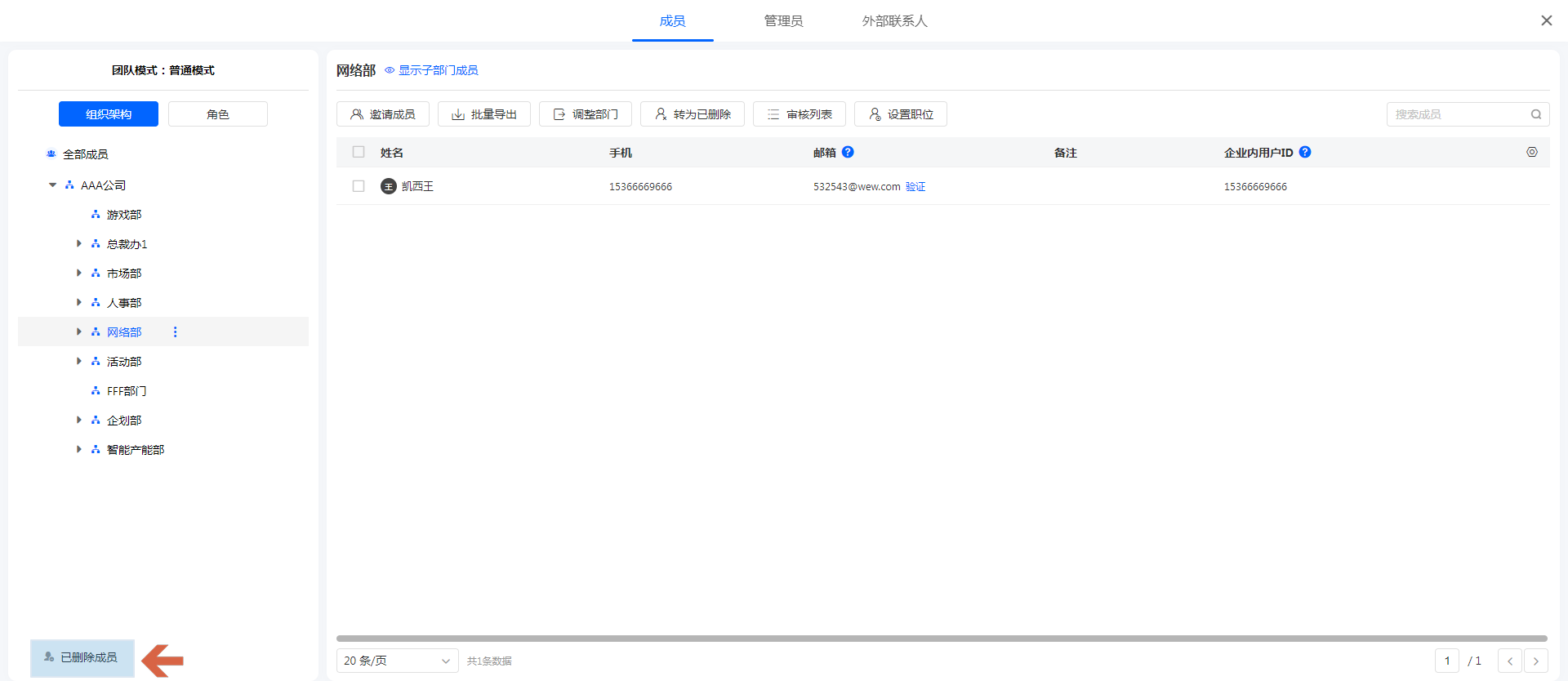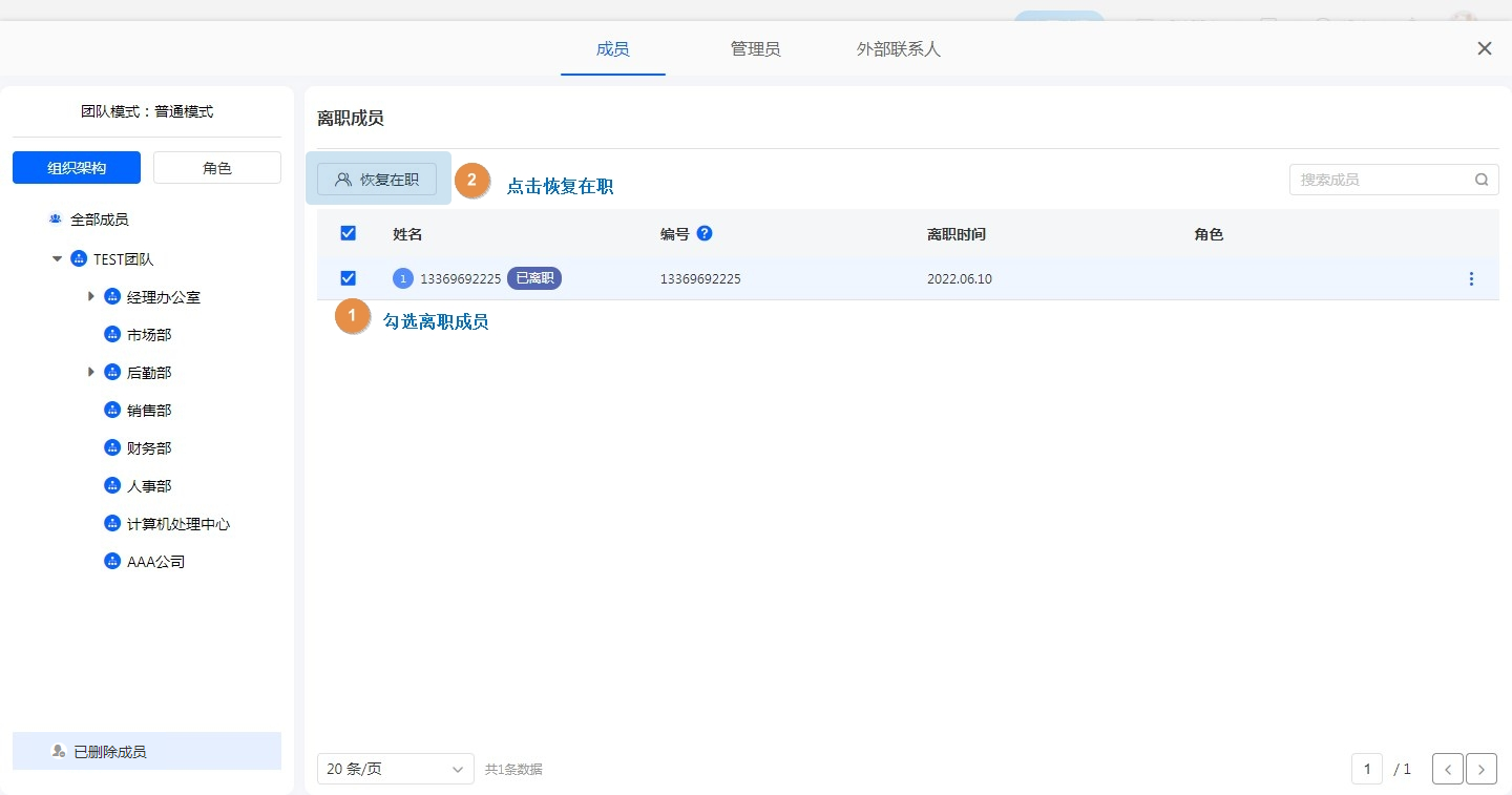 恢复在职可以将选中已删除成员恢复到在职状态,部门恢复到顶级部门下。