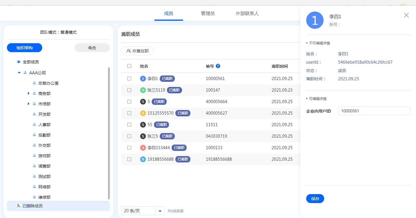 可以编辑已删除成员的企业ID。