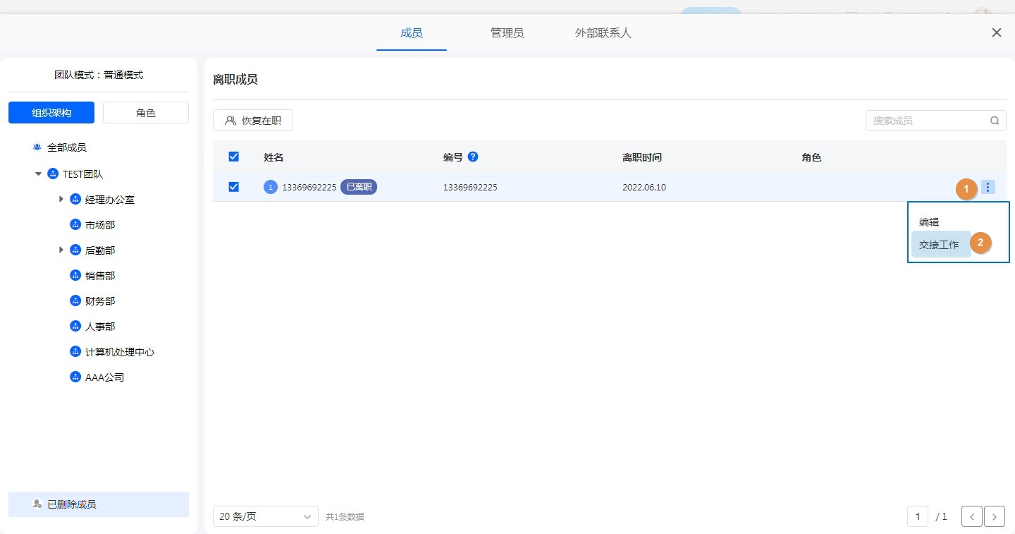 已删除成员支持交接工作,详情参考交接工作。