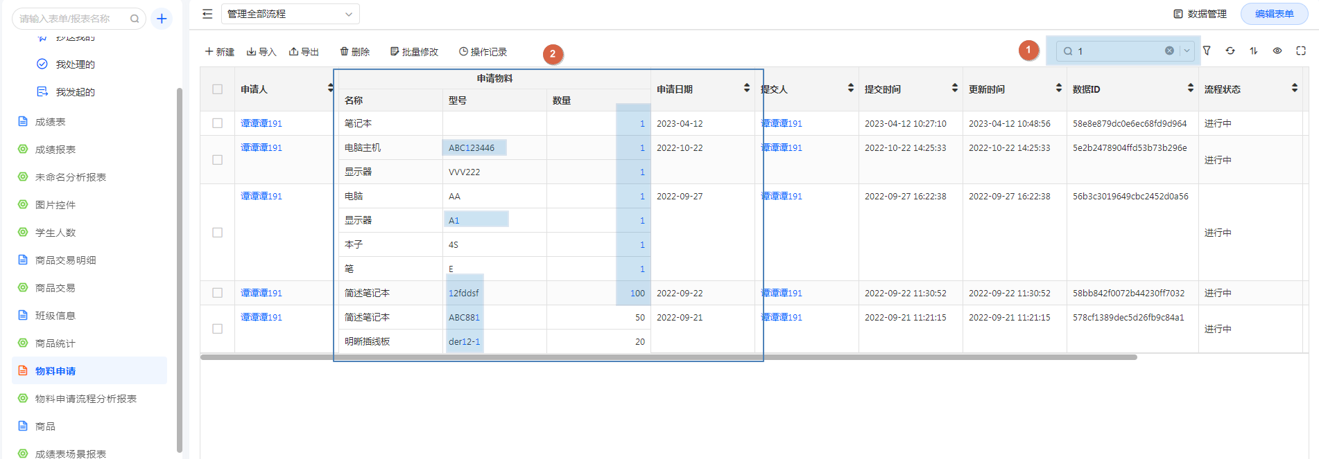 • 如果是某条数据的某条子表数据命中了关键字,则整条数据都显示。即显示该条数据的所有子数据。