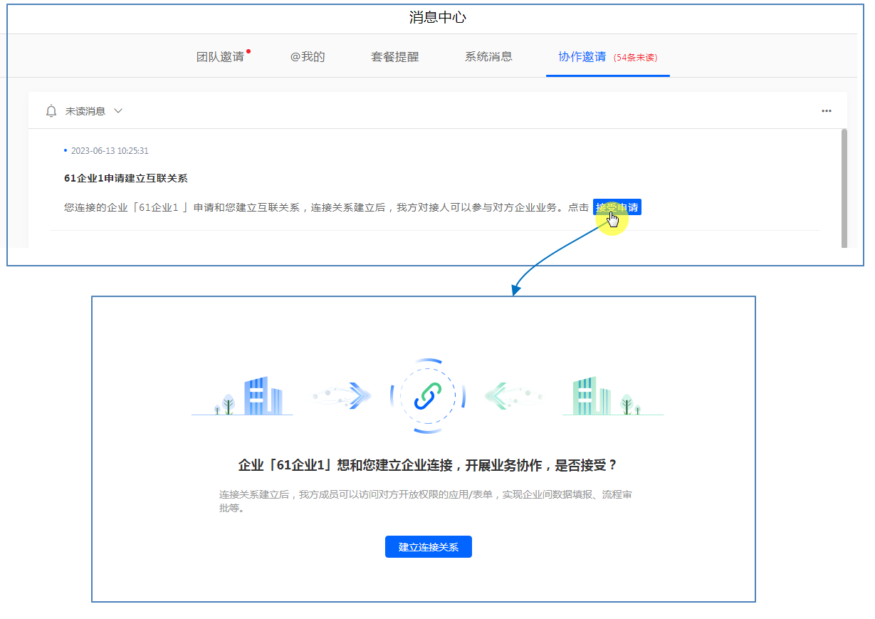 点击「连接对方企业」后,会给对方企业的创建者或系统管理员发送系统消息和邮件,在消息中点击【接收邀请】,在跳转页面完成连接。