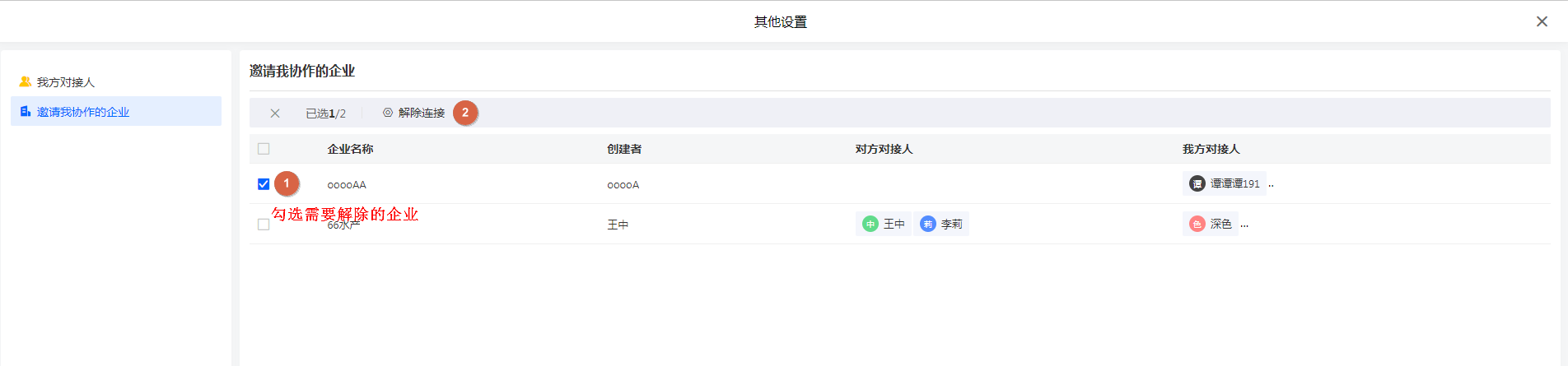当不需要参与到对方的业务中时,可以在「连接我的企业」处,选中不需要连接的企业「解除连接」。如下如所示: