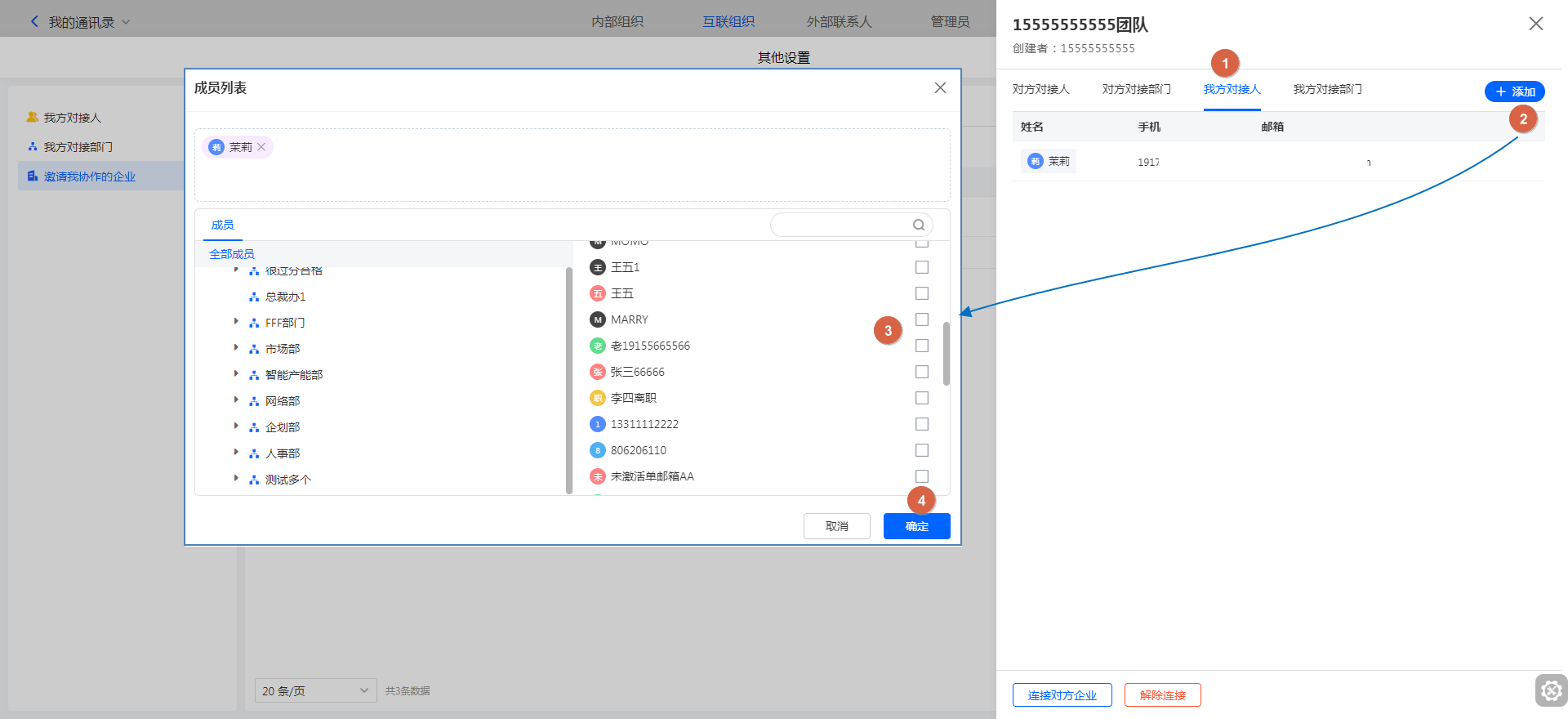 • 查看对方对接人&查看对方连接部门