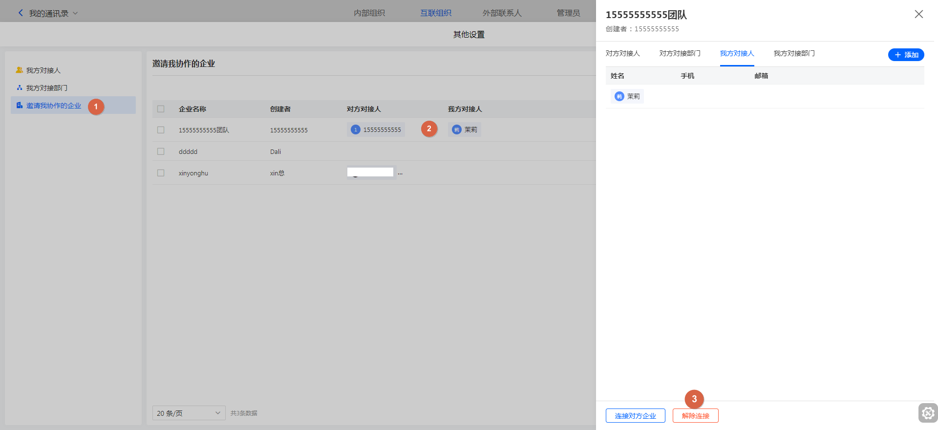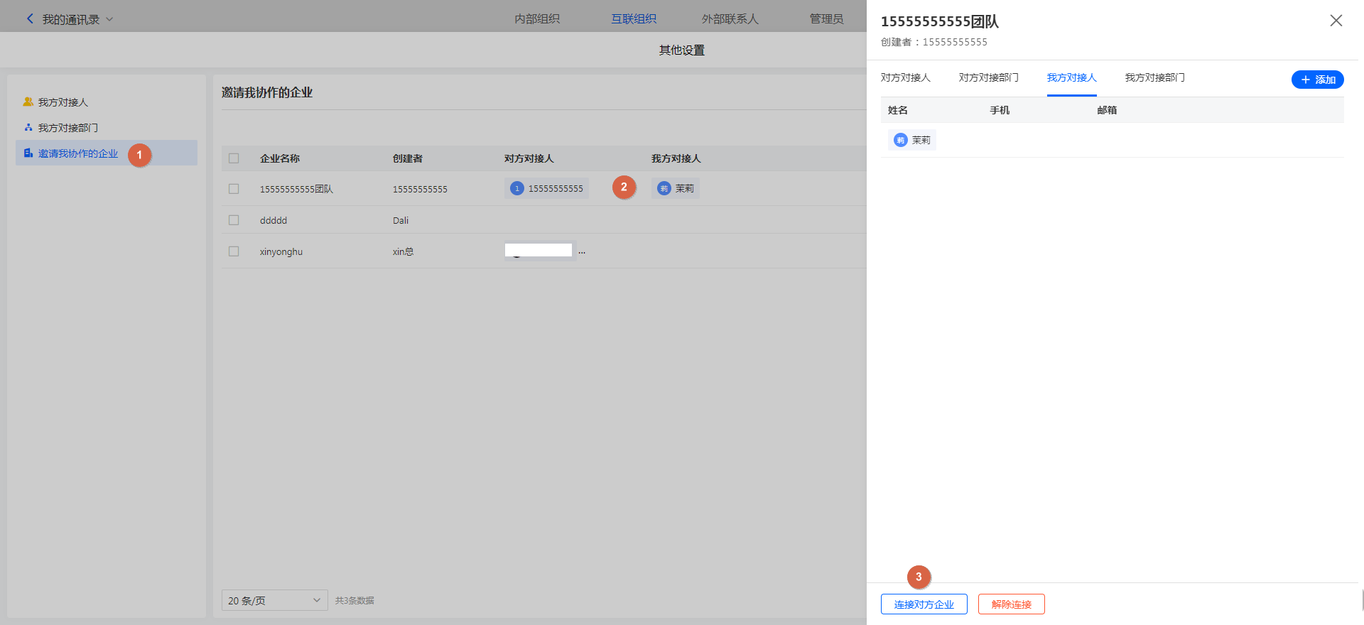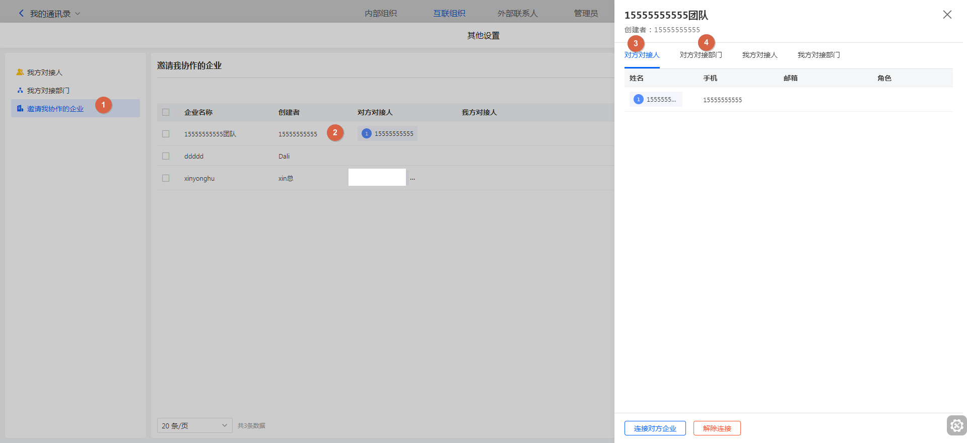互联组织中找到「邀请我协作的企业」,找到对方企业点击进行详情页,在「对方对接人」&「对方对接部门」下,可以查看对方的对接信息。