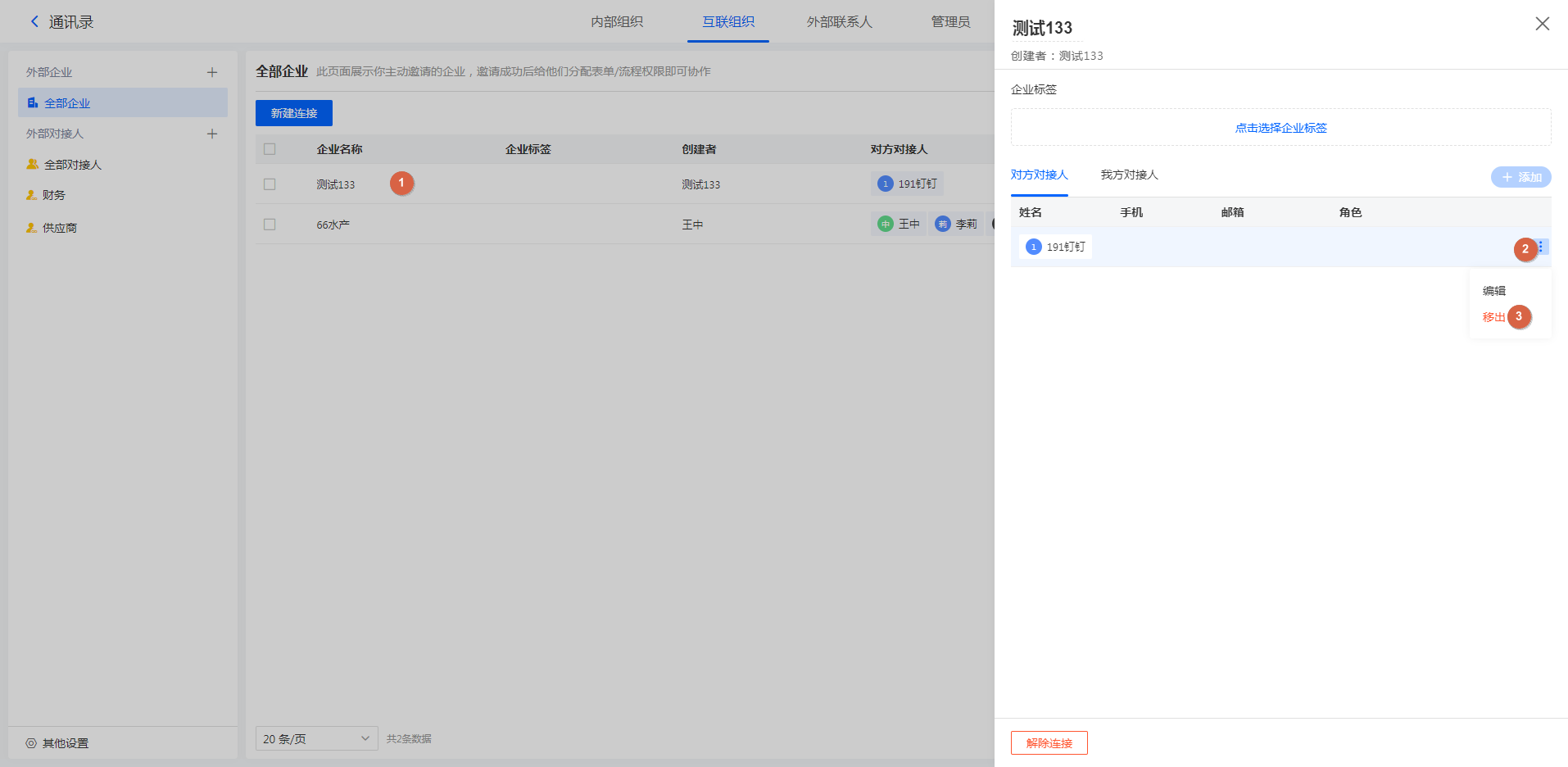 注:移出后,对接人无法再参与此角色相关的外部企业协作,但不会删除移出的对接人,可在全部对接人处继续设置角色。