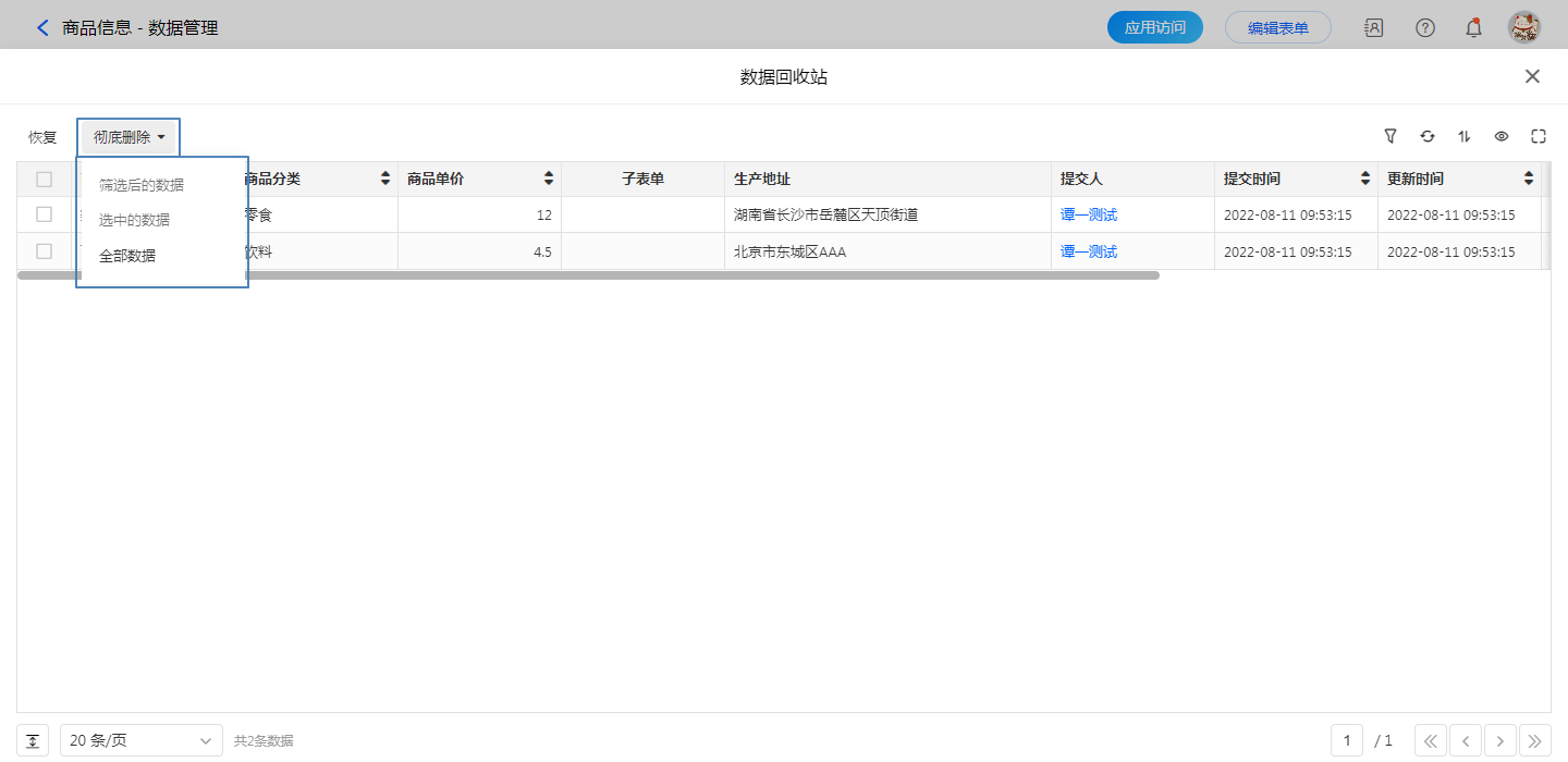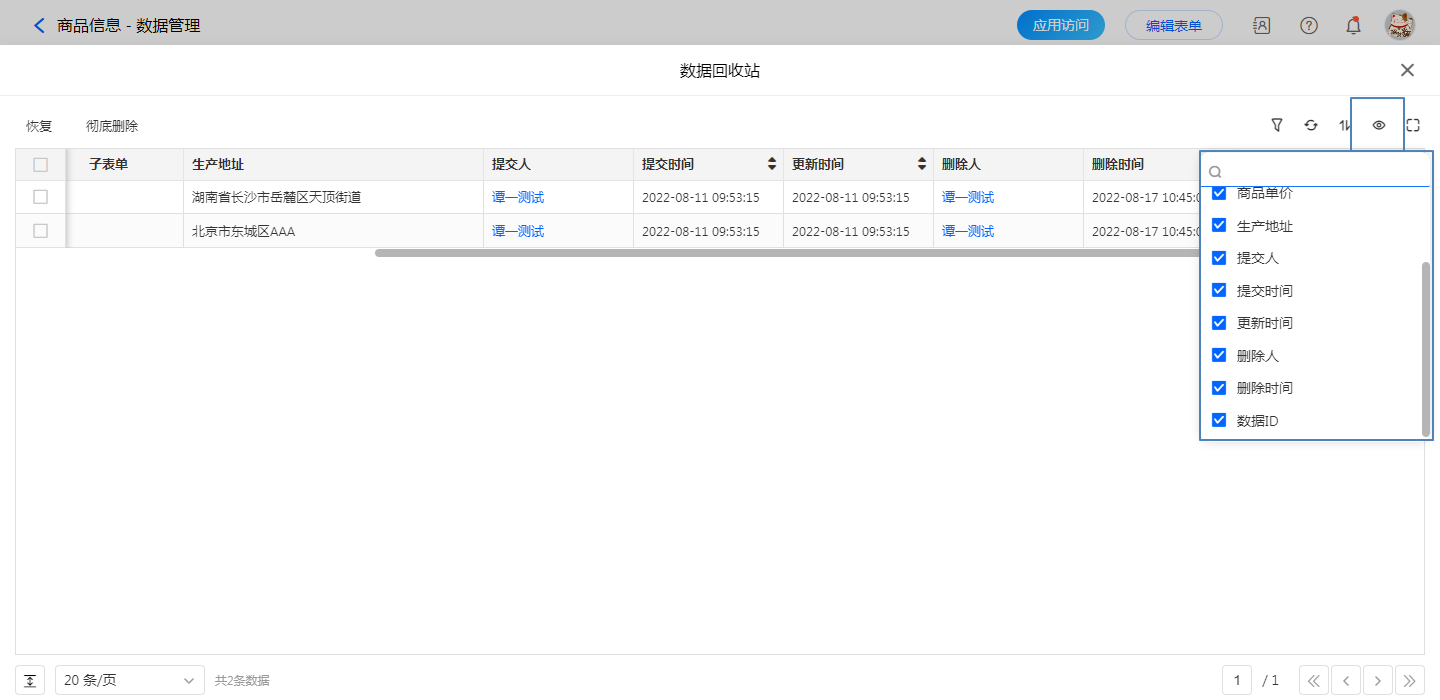 数据回收站中的显示字段可自行设定,其中包括系统字段:删除人与删除时间。 g)