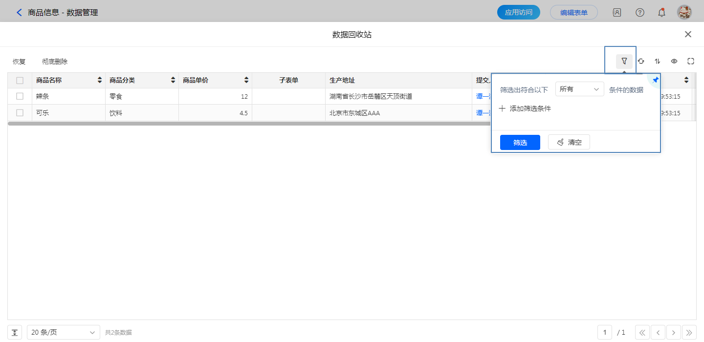 恢复数据可选择恢复筛选后的数据、恢复选中、恢复全部的数据,操作之后可以回到数据管理中看到恢复的数据。