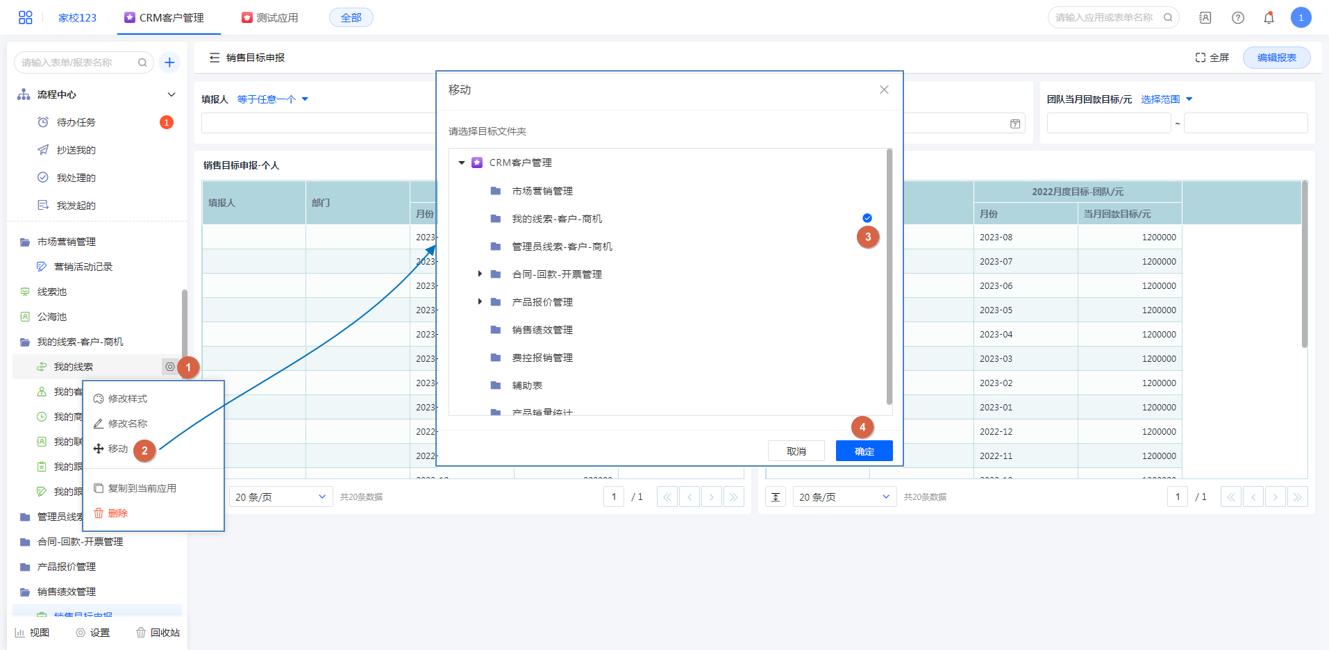• 选择要移动的表单/报表,点击设置进入移动选项,移动至目标分组。