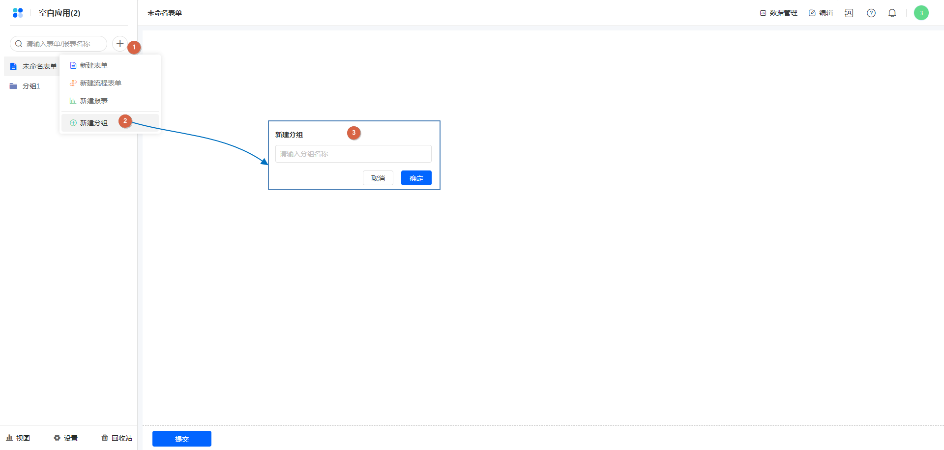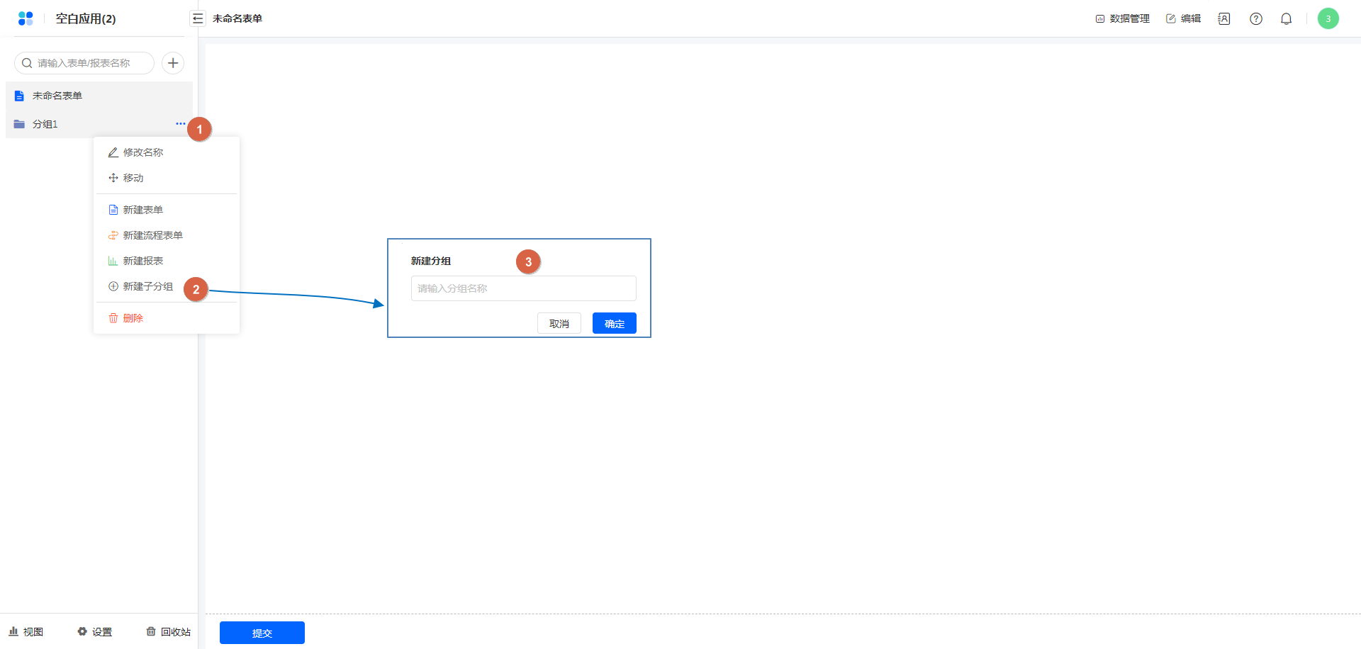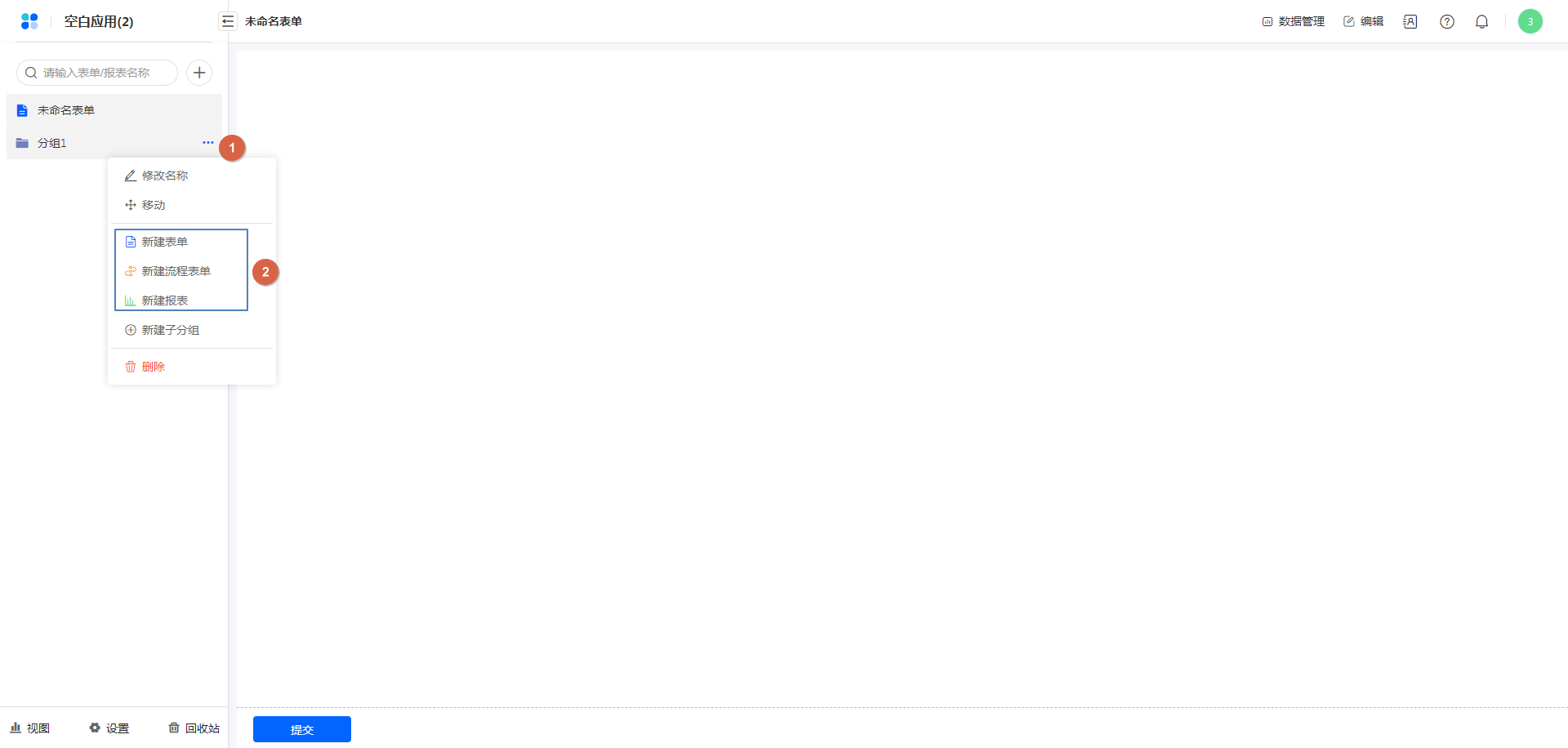 点击分组右侧的设置按钮,选择新建表单/报表,即可直接在分组下创建表单/报表。