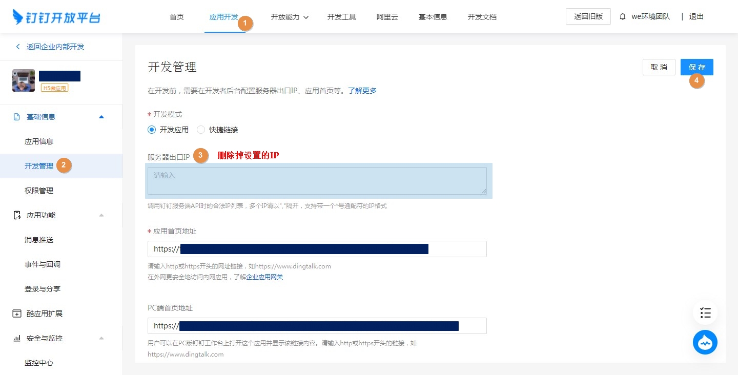 钉钉团队管理员登录钉钉开发者后台,进入[自建应用]>>[开发管理],点击修改,删除已设置的[服务器出口IP],保存。