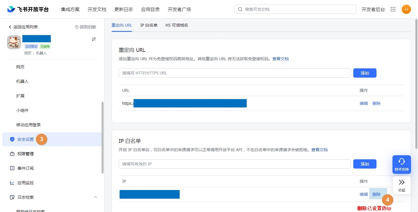 飞书团队管理员登录飞书开放平台,进入[自建应用]>>[安全设置],删除已添加的[IP白名单]