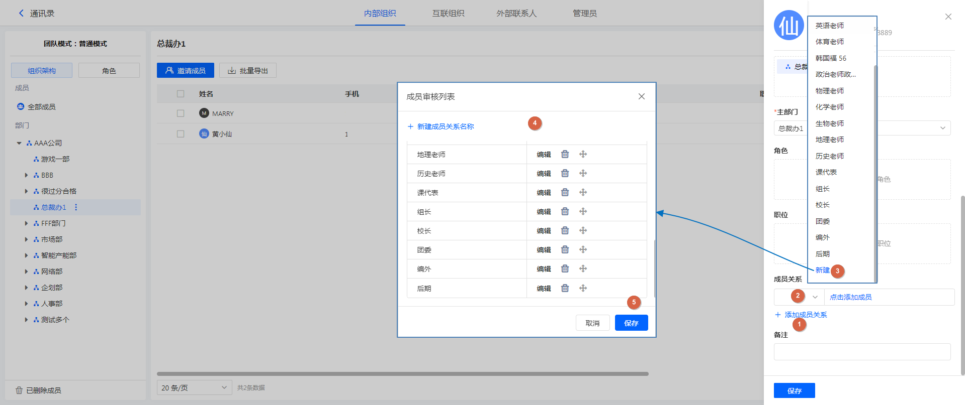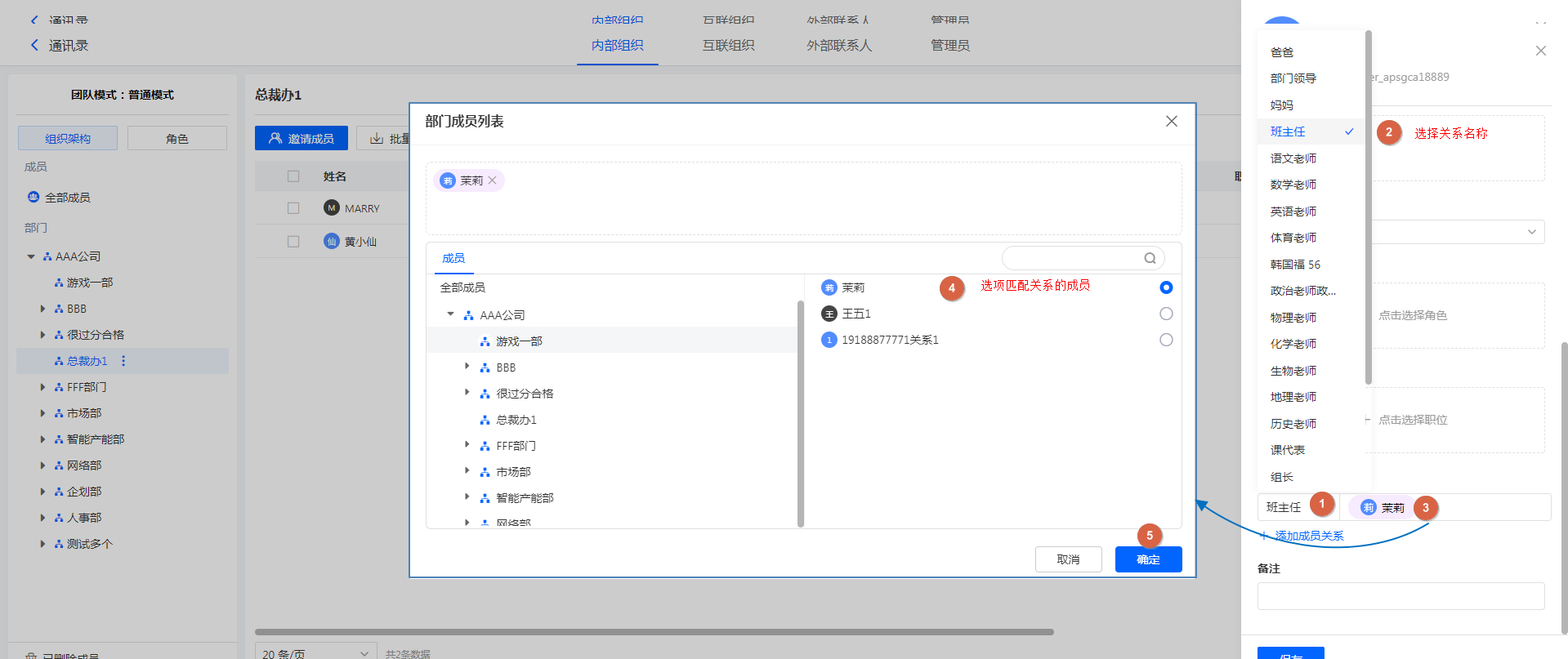 通讯录中,选择一个成员,在成员详情面板,可以设置成员关系。